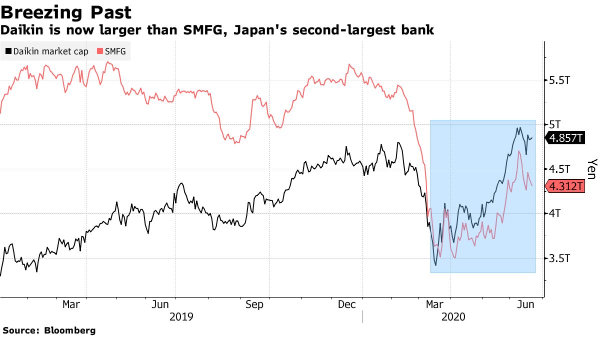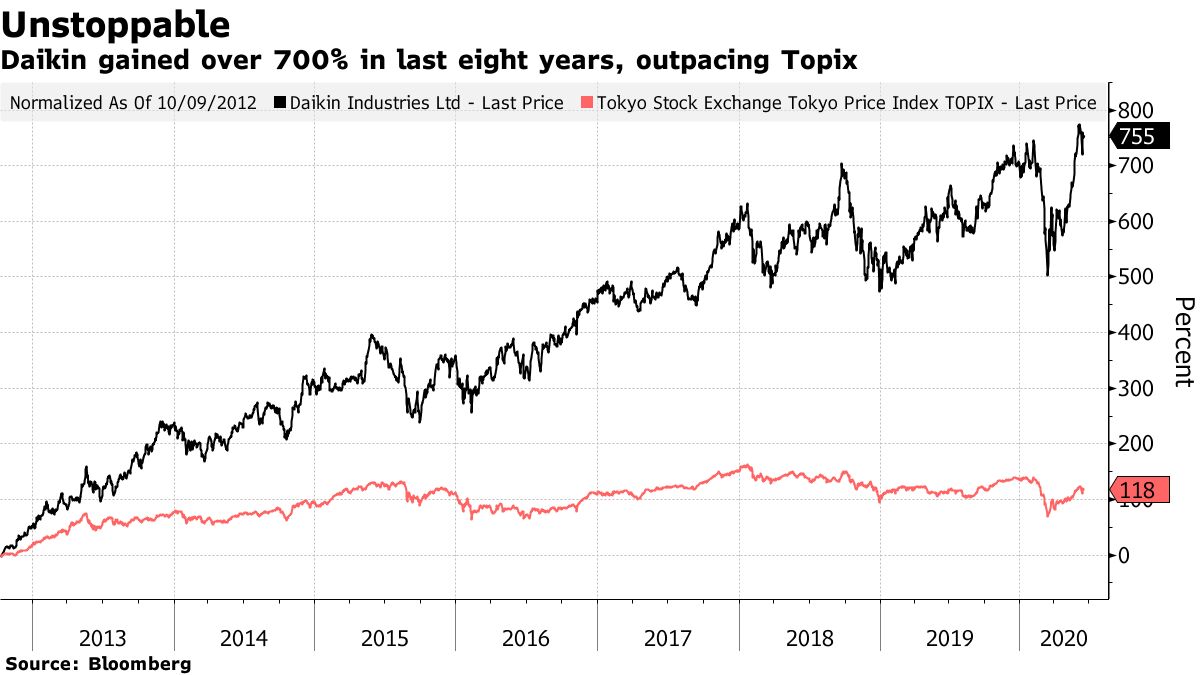 接近5万亿日元(470亿美元)的市场价值,全球最大的空调制造商经历了近八年的几乎不间断的增长,其股价上涨超过700%。它现在是东证指数第19大股票,市值超过日本第二大巨型银行。今年该股票的表现也比整体指数高出15个百分点。