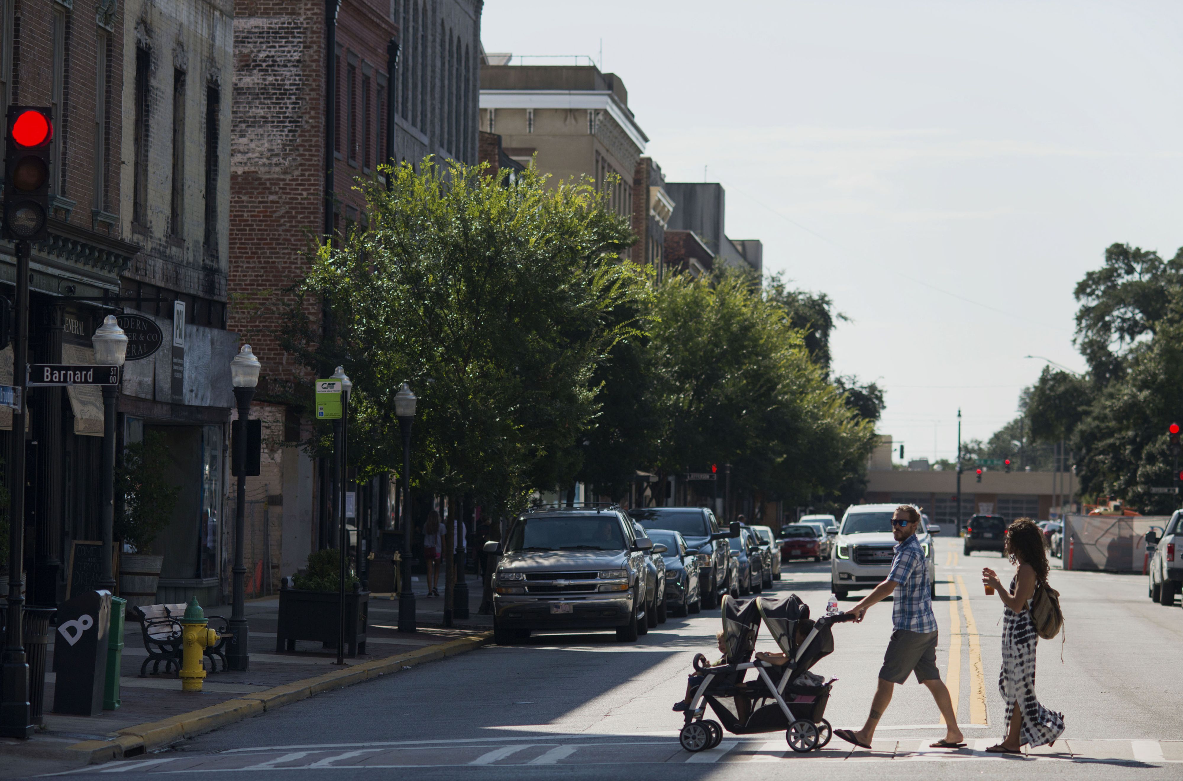 一名男子在乔治亚州萨凡纳的布劳顿街上推着婴儿车行走。该市正在为愿意搬迁的科技工作者提供激励措施。