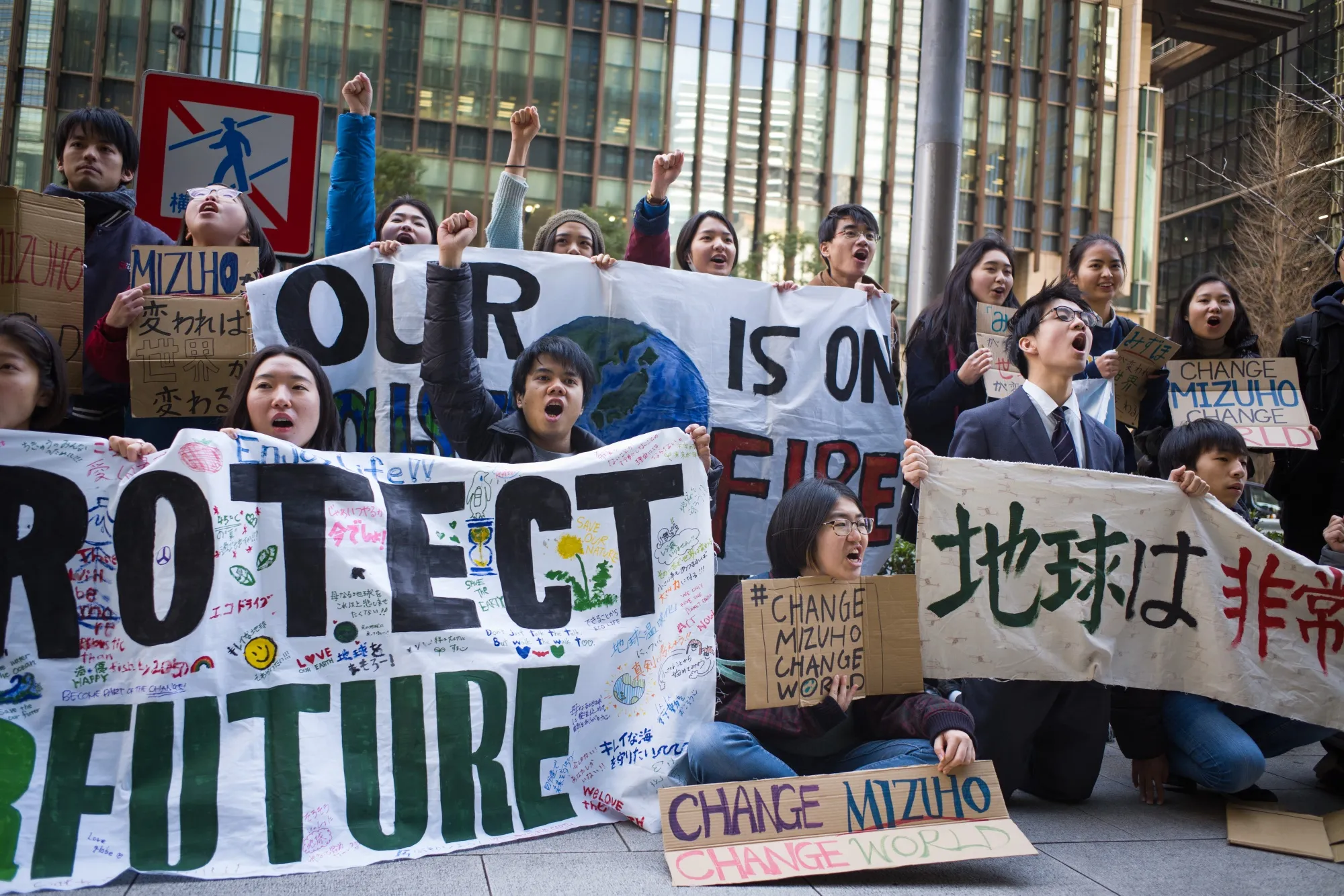 气候活动人士在3月6日瑞穗金融集团总部外的示威活动中高呼口号。