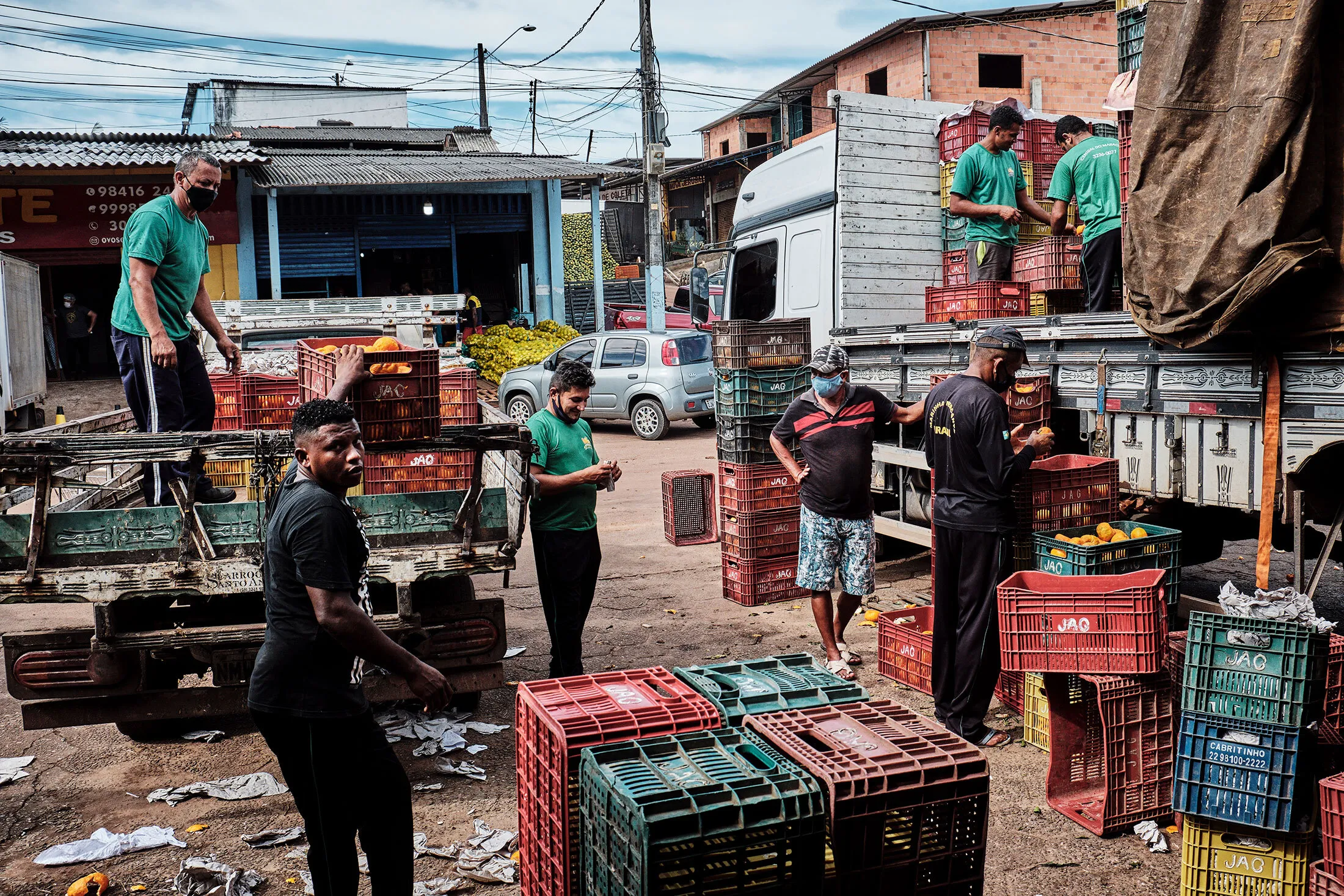 在塞阿萨,圣路易斯的水果和蔬菜供应中心,工人在工作。摄影师:古斯塔沃·米纳斯,彭博商业周刊即使在病毒在他的核心圈子中传播时,总统也发出了矛盾的信号。3月12日,他要求支持者取消计划中的集会以支持他的政府——但随后还是出现在巴西利亚的一场集会上,未戴口罩,与与会者击掌。那个月底,他敦促州长们减少隔离措施,并声称尽管他65岁,作为一名“前运动员”,他对新冠病毒没有什么可怕的。“病毒就在这里,”他在一个星期天走访商店时说。“我们必须面对它,但要像个男人一样面对。”
