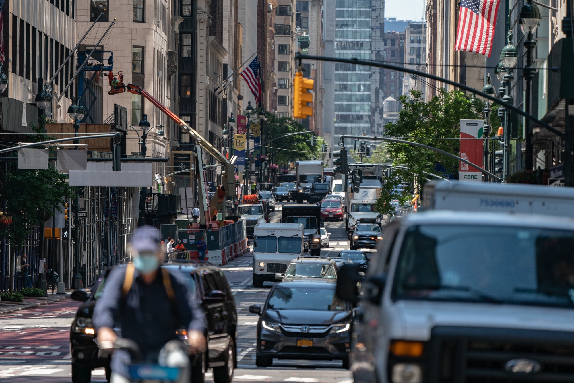车辆在美国纽约麦迪逊大道的交通中停滞不前,时间是6月9日。