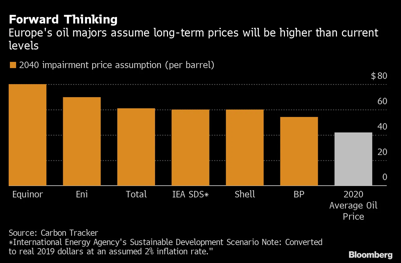 在三月份与投资者交谈时,埃克森美孚和雪佛龙都给出了每桶60美元的长期现金流预测,约为过去五年的平均水平。但这些预测并不是长期价格预测,也没有提供气候规划或潜在减记的见解。与此同时,原油目前的交易价格约为每桶40美元,全球需求恢复的持续不确定性以及OPEC是否能够维持减产仍然存在。