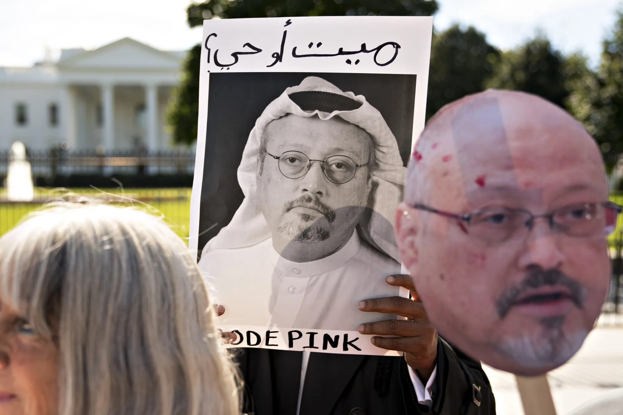示威者在2018年10月19日白宫外举着哈苏吉的照片。摄影师:安德鲁·哈雷尔/彭博社