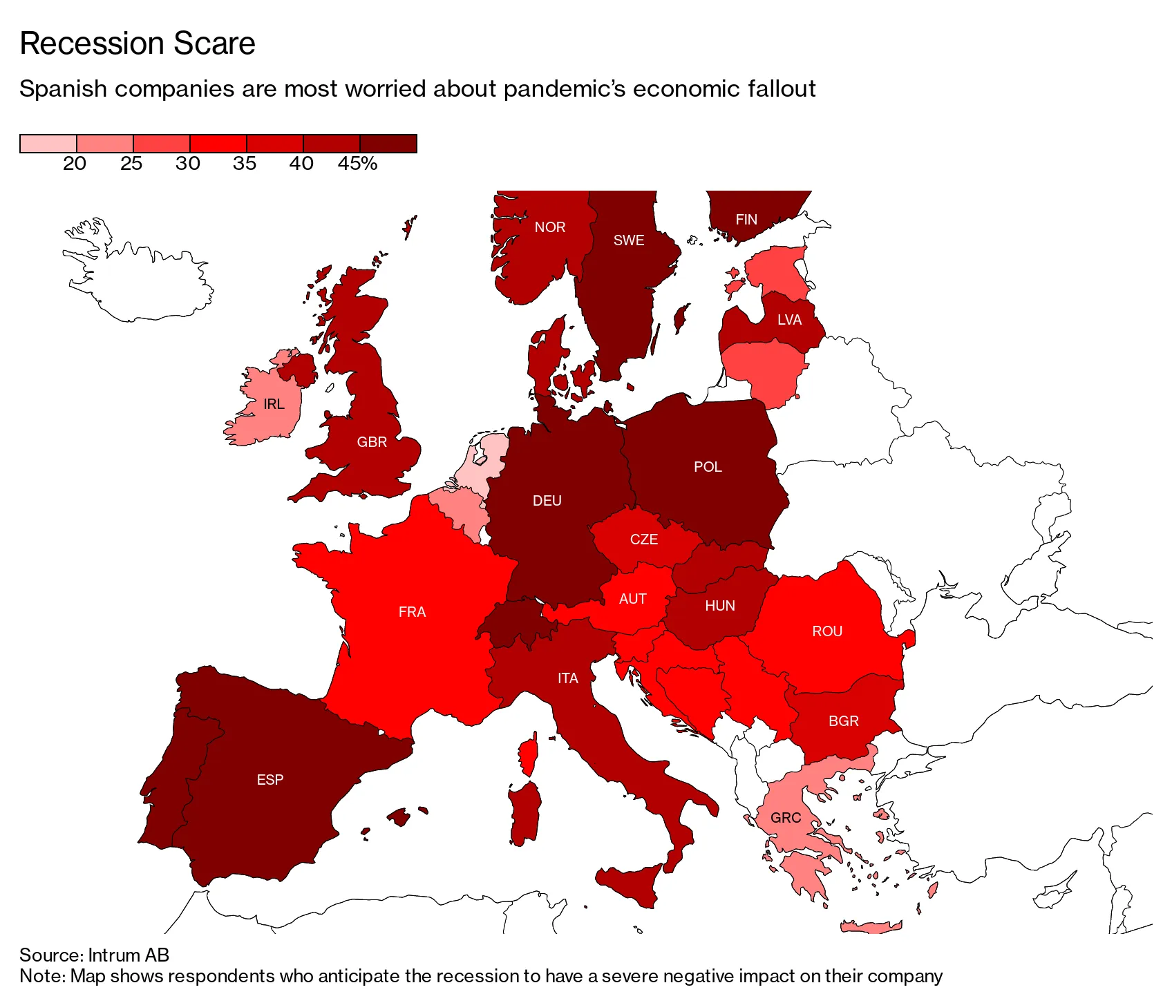 根据瑞典债务催收公司Intrum的一项新调查,西班牙的企业对冠状病毒的经济影响最为担忧,而荷兰的公司则最不担心。在调查的9,980家公司中,三分之二的公司将未来12个月内阻止客户按时付款的三大挑战中,泛欧经济衰退的风险排在前三位。