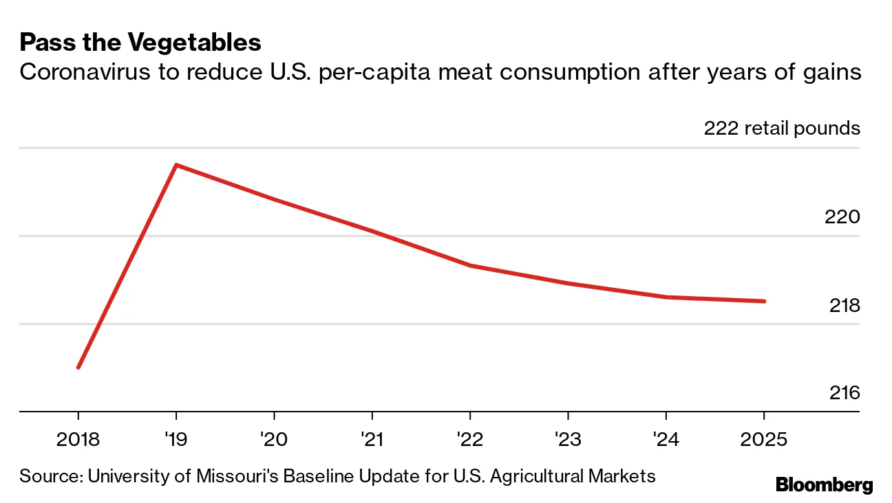 人均肉类消费 今年预计将降至九年来的最低水平,较去年下降3%代表自2000年以来最大的降幅,联合国的数据指出。值得注意的是,这一变化正在每个主要市场发生。在美国,预计人均需求要到2025年后才能恢复到疫情前的水平。