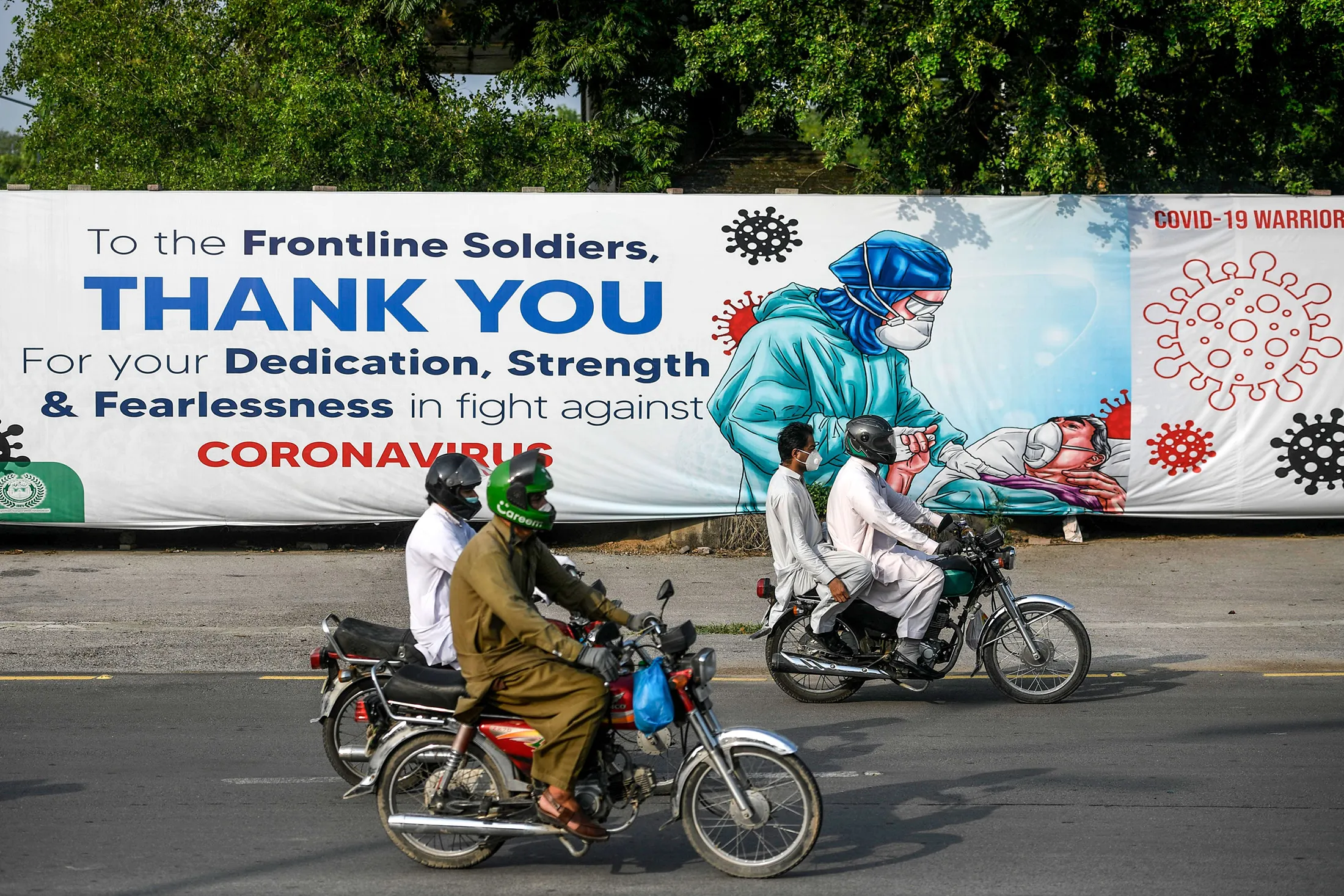 摩托车手在伊斯兰堡经过一条向健康和医疗工作者致敬的横幅,时间是7月8日。摄影师:阿米尔·库雷希/法新社