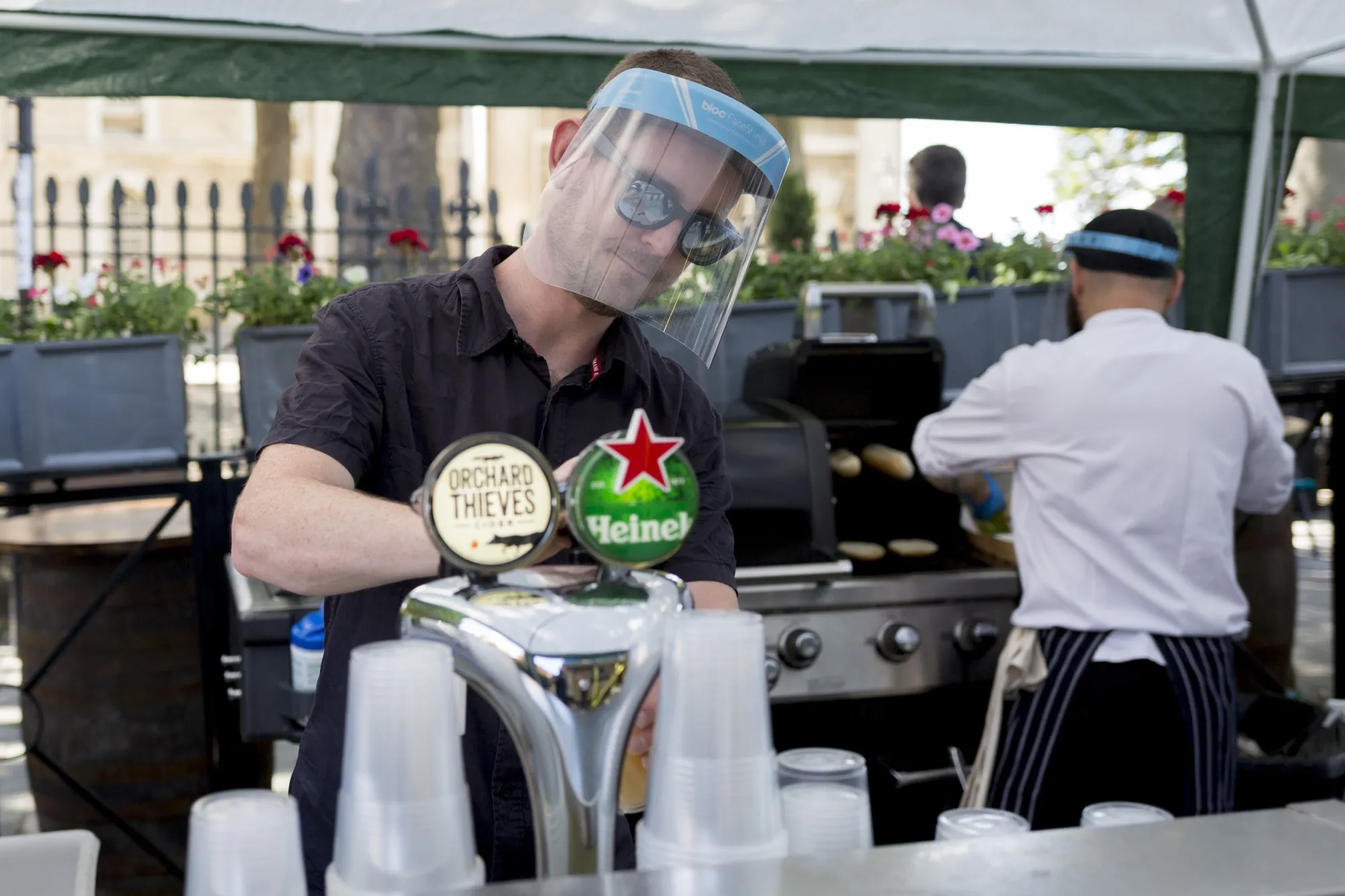 位于格林威治泰晤士河畔的特拉法加酒吧的工作人员在伦敦为顾客提供服务,佩戴着必要的面罩。摄影师:理查德·贝克/图片社但并不是所有人都会急于推门而入。一项YouGov在6月中旬的民调发现只有26%的人表示他们会感到舒适去酒吧——而有两倍的人表示他们愿意坐在酒吧的花园里。尽管有报道称许多人在重新开放的周末挤满了酒吧,但已经有一些酒吧在顾客检测呈阳性后关闭。