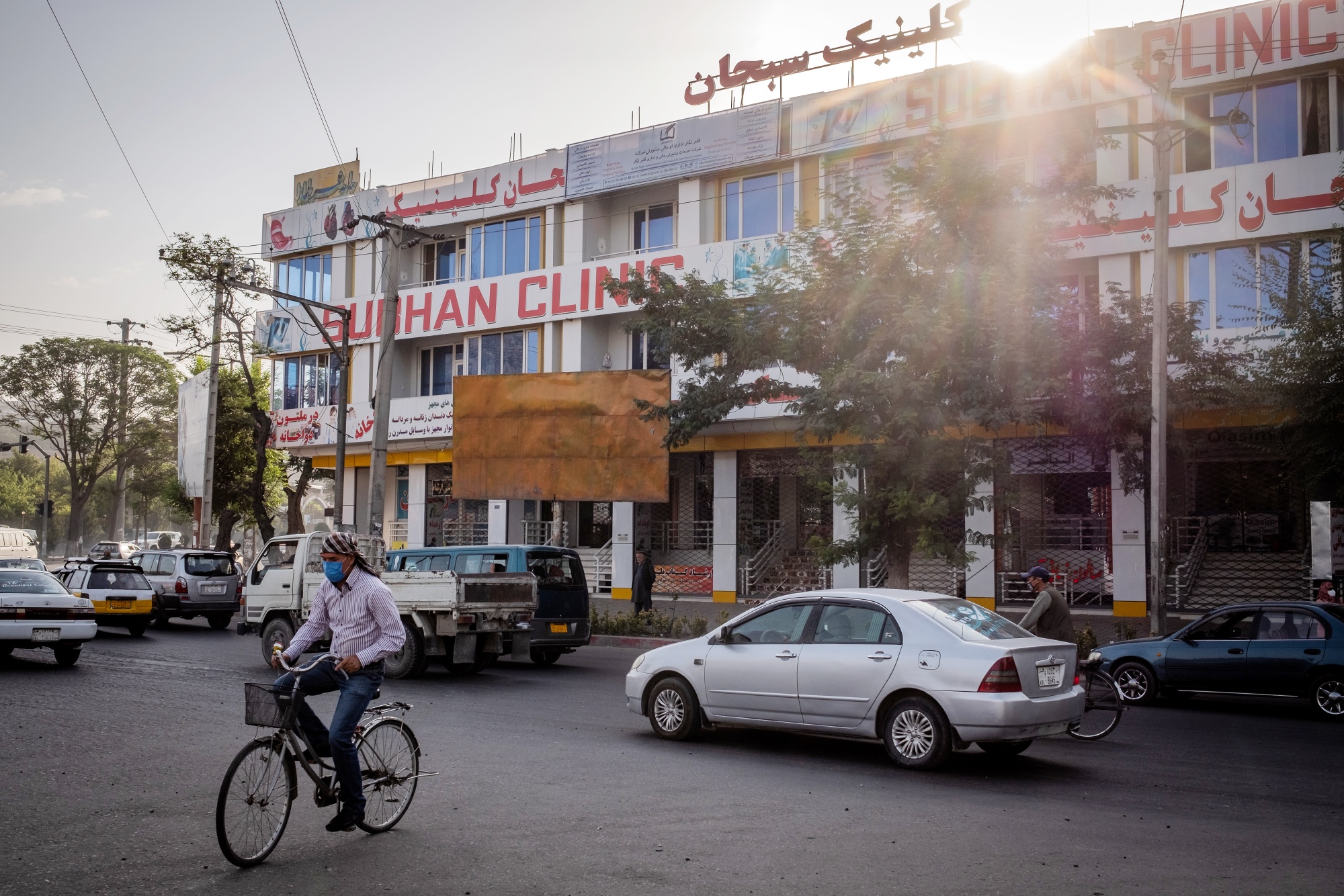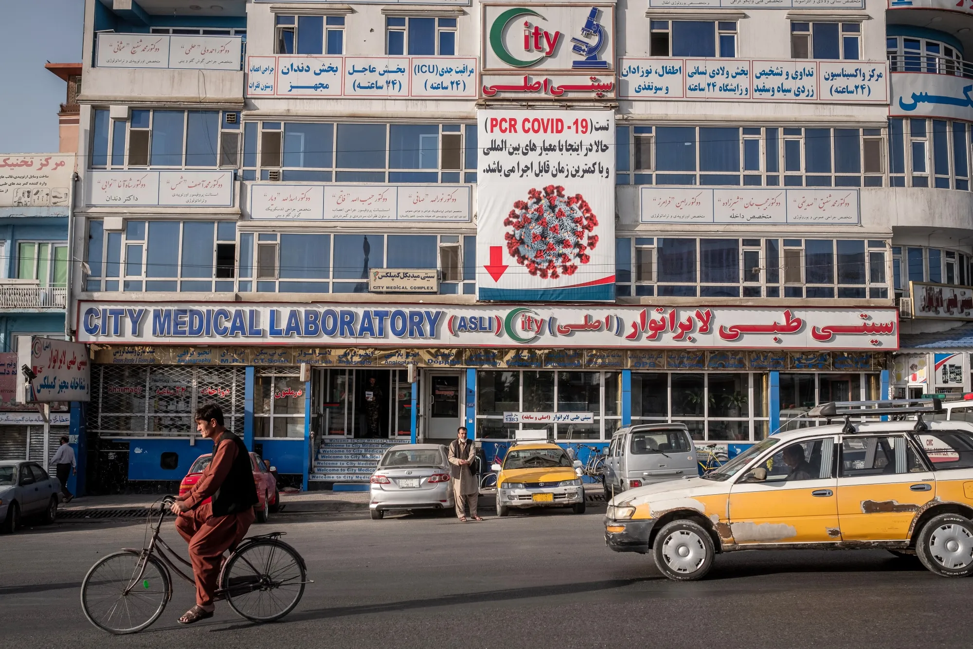 一名骑自行车的人经过喀布尔的苏巴汉诊所,该诊所因未经有效许可出售自己的抗冠状病毒药物而被阿富汗卫生部关闭。