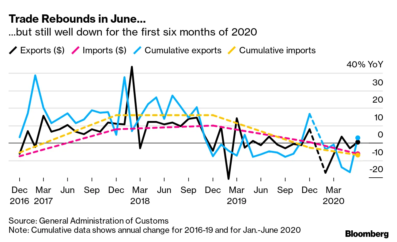 中国的出口和进口在六月都出现了增长,表明国内外的需求可能已经开始恢复,即使疫情仍在肆虐全球经济。出口同比增长0.5%,而进口增长2.7%。经济学家预测这两者都会下降。贸易顺差从五月的历史高点缩减至上个月的464亿美元。
