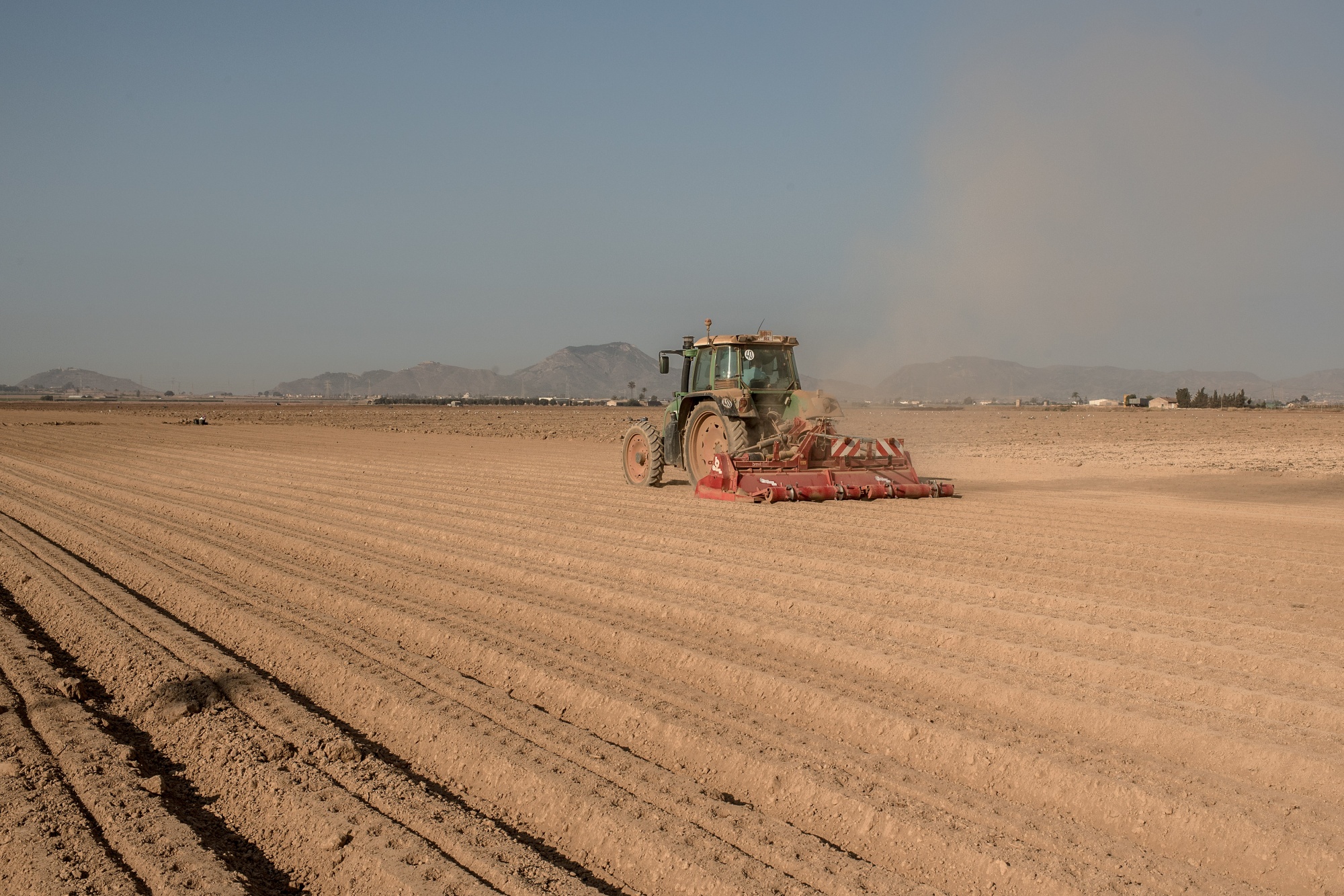 一辆拖拉机在西班牙洛斯阿尔卡萨雷斯的卡塔赫纳农业区的田野中行驶,扬起了尘土。