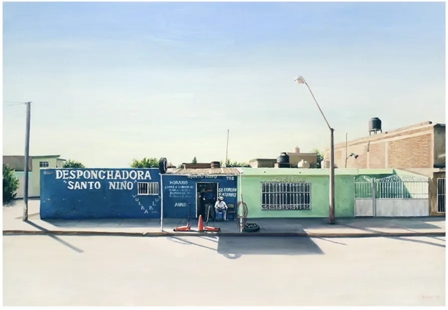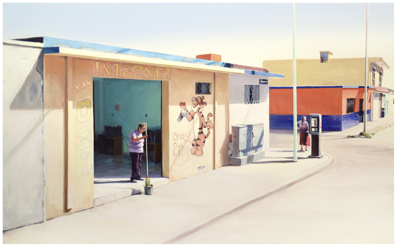 “阳光明媚的日子,”丙烯画在画布上,与原始街景相比。感谢 Sohyun AnAn 自那时以来所画的数十幅肖像代表了她在 Durango 的尘土飞扬、日晒的街道上漫游屏幕的日子,寻找那些吸引她的图像。她所描绘的场景包括一位在互联网咖啡馆拖地的女性、前廊上两个空荡荡的摇椅,以及轻柔的微风吹动咖啡馆的窗帘门口。她常常寻找良好的光线,但她的主题选择主要是由直觉引导的。