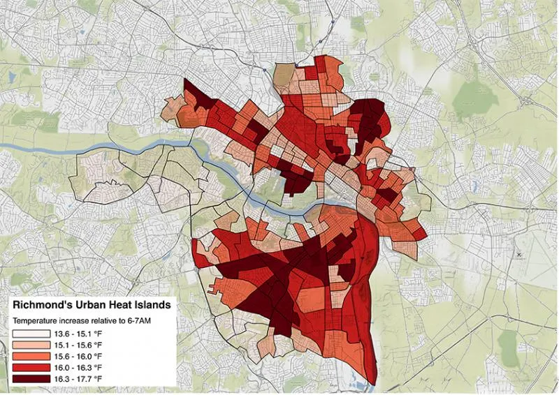 里士满,弗吉尼亚州按人口普查区块组划分的城市热脆弱性,该地区参与了之前的社区热映射工作。杰里米·霍夫曼,弗吉尼亚科学博物馆/气候.gov与贫困、空调使用和其他指标的信息叠加,这些地图可以揭示夏季公共健康的重要维度,因为高温可能引发呼吸系统疾病和其他问题,罗阿诺克的可持续发展和外联协调员内尔·博伊尔表示。然后,城市可以创建绿地、种植树木并减轻表面热量作为缓解措施。