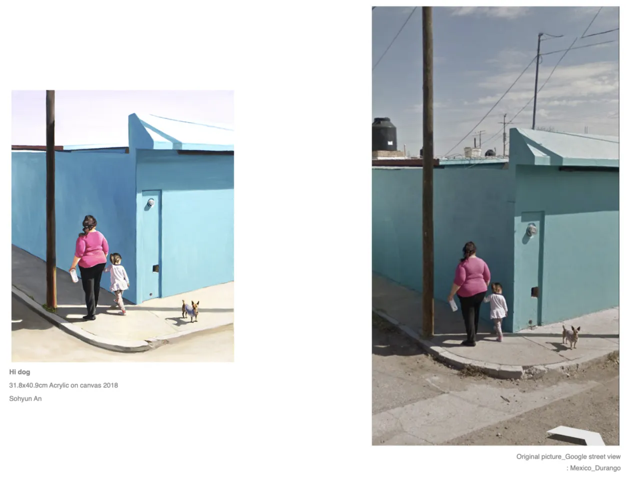 “嗨,狗,”丙烯画在画布上,与原始街景场景相比。感谢 Sohyun An“我想到艺术家的工作是美化那些许多人未曾注意的地方,”她在一封电子邮件中写道。