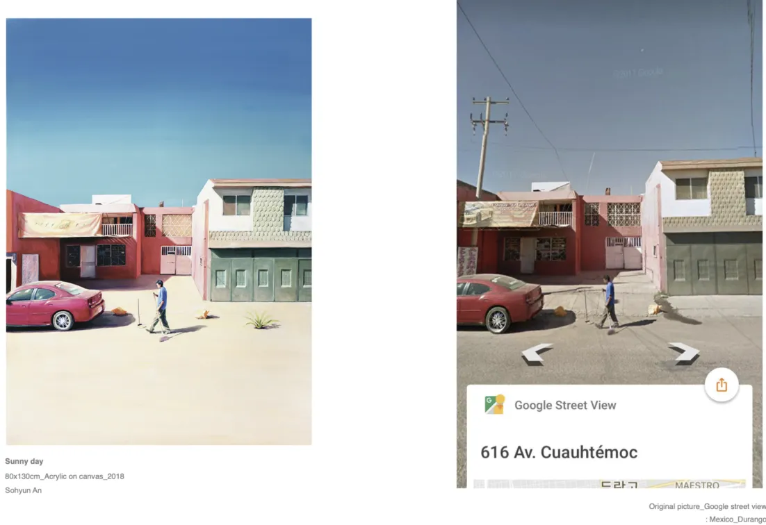 “一切都会好起来的,”丙烯画在画布上。感谢 Sohyun AnAn 解释说,她的绘画实践延续了谷歌照片所开始的现实表现过程,或者她所说的“现实>数字>绘画”的链条。由于许多街景照片至少是在三四年前拍摄的,她的画作挖掘出那些瞬间,这些瞬间之所以被捕捉并不是因为它们本身重要,而仅仅是因为谷歌的汽车恰好经过。