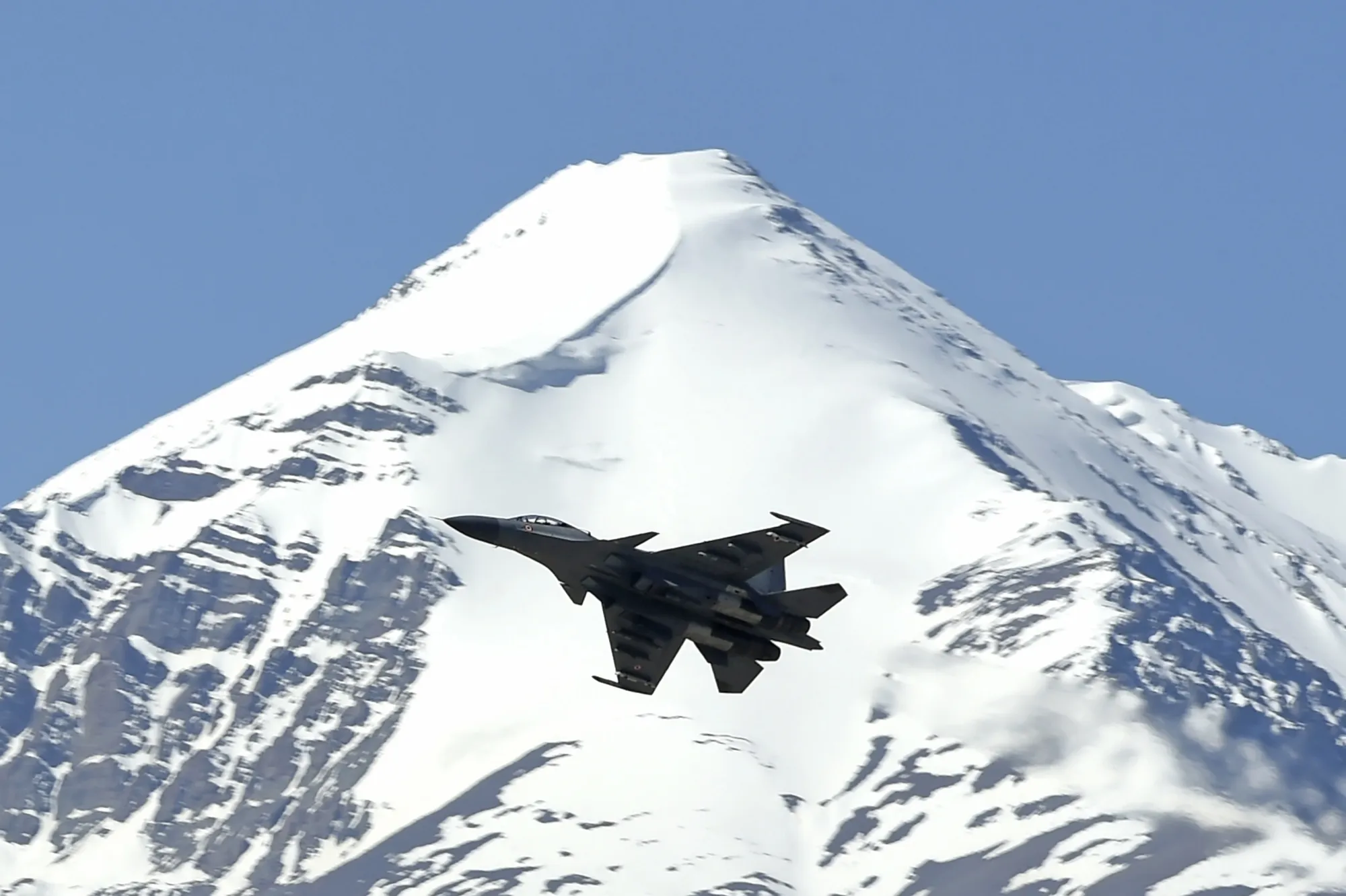 一架印度战斗机于6月23日在拉达克的山脉上空飞过。摄影师:Tauseef MustafaAFP via Getty Images
