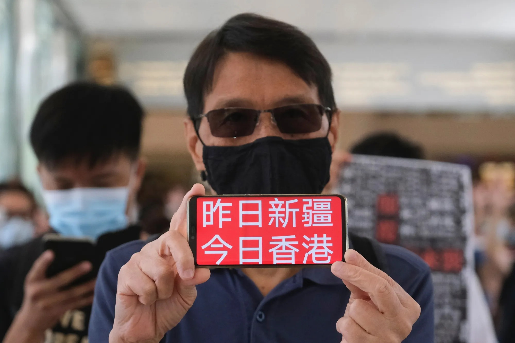 一名示威者在6月12日的香港游行中举着一部智能手机,屏幕上写着“昨天新疆,今天香港”。摄影师:罗伊·刘/彭博社告诉我们我们做得如何或我们缺少什么,发送至 [email protected]*。*