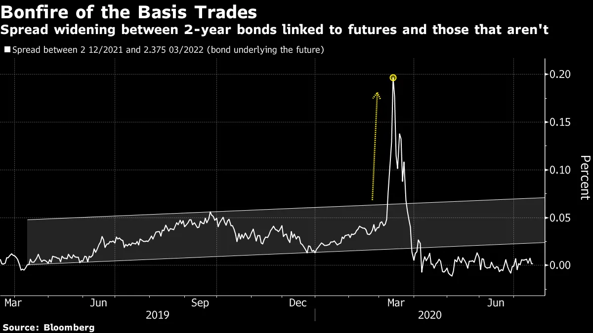 你知道什么可能不是好事吗?高度杠杆的账户可能会对世界最大的债券市场产生过大的影响。回到三月份,当美国国债市场短暂冻结时,注意力集中在一个鲜为人知的交易上,看到对冲基金试图套利美国政府债务的现金市场和期货市场之间的差异。这些国债基差交易通常涉及投资者购买最便宜的可交割债券,并出售相关的期货合约以获取差价。许多这些头寸是通过回购市场融资的,投资者借入现金以抵押品作为担保。