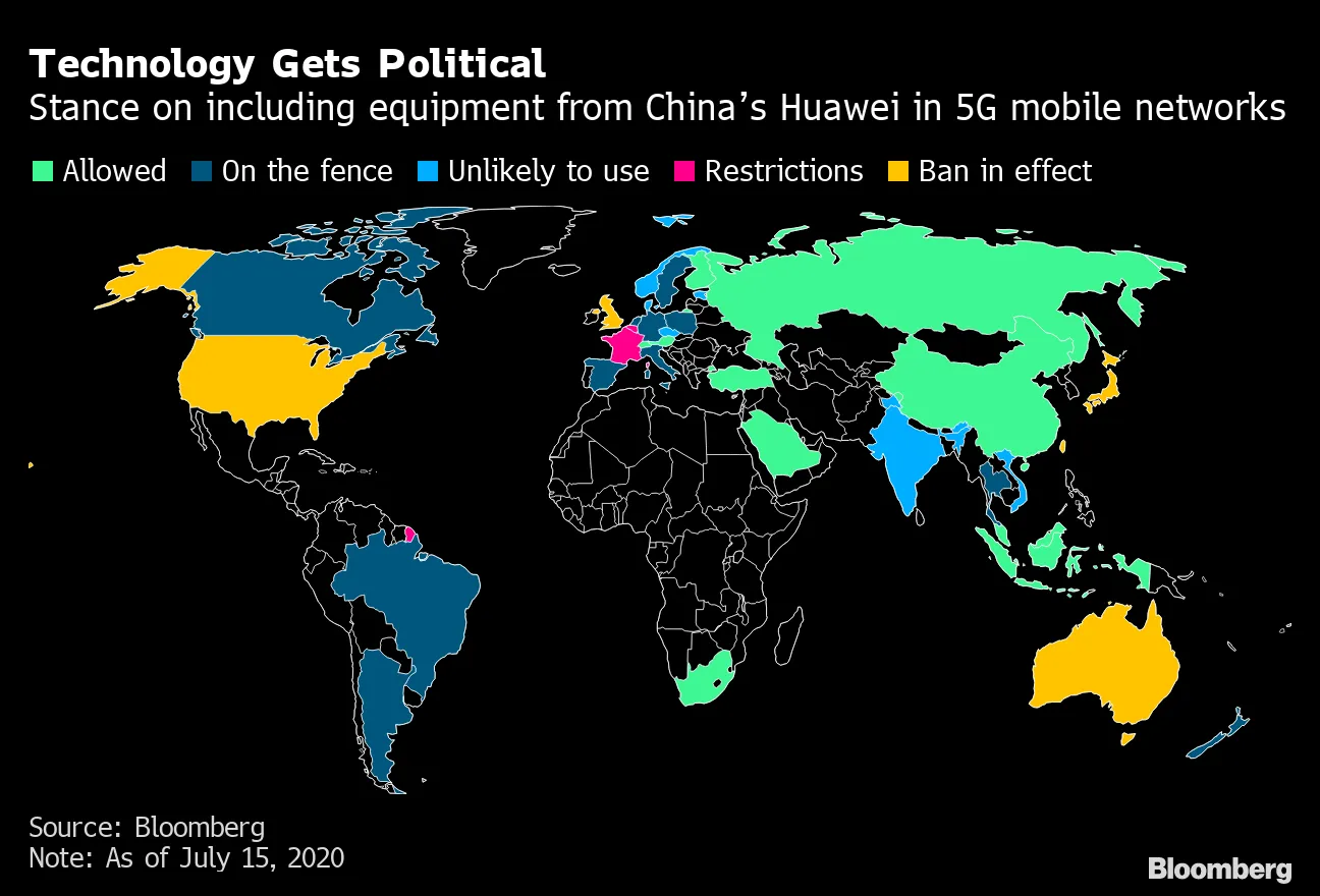 华盛顿在本周的科技战争中取得了显著胜利。英国在一月份刚刚表示将允许一些华为设备进入其5G移动网络,现在宣布 完全禁止 这家中国科技巨头。此外,运营商被要求在2027年前从其网络中移除所有现有的华为设备。这一逆转发生在美国在五月采取行动进一步限制华为获取半导体之后,这使得英国得出结论,认为该公司可能不得不使用潜在不安全的技术来抵消美国的制裁。特朗普总统在华盛顿告诉记者 他亲自干预了 这一决定。当然,北京对这一禁令进行了抨击,中国驻英国大使表示两国之间的信任受到了破坏。现在的关注点将转向哪些国家可能会受到英国决定的影响并发布类似的禁令。