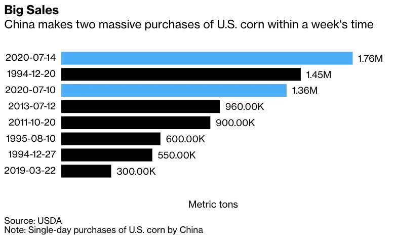 美国农业部周二宣布,中国进行了其有史以来最大规模的美国玉米采购,购买了176.2万吨该粮食。这是在中国买家于7月10日购买了136.5万吨玉米之后。