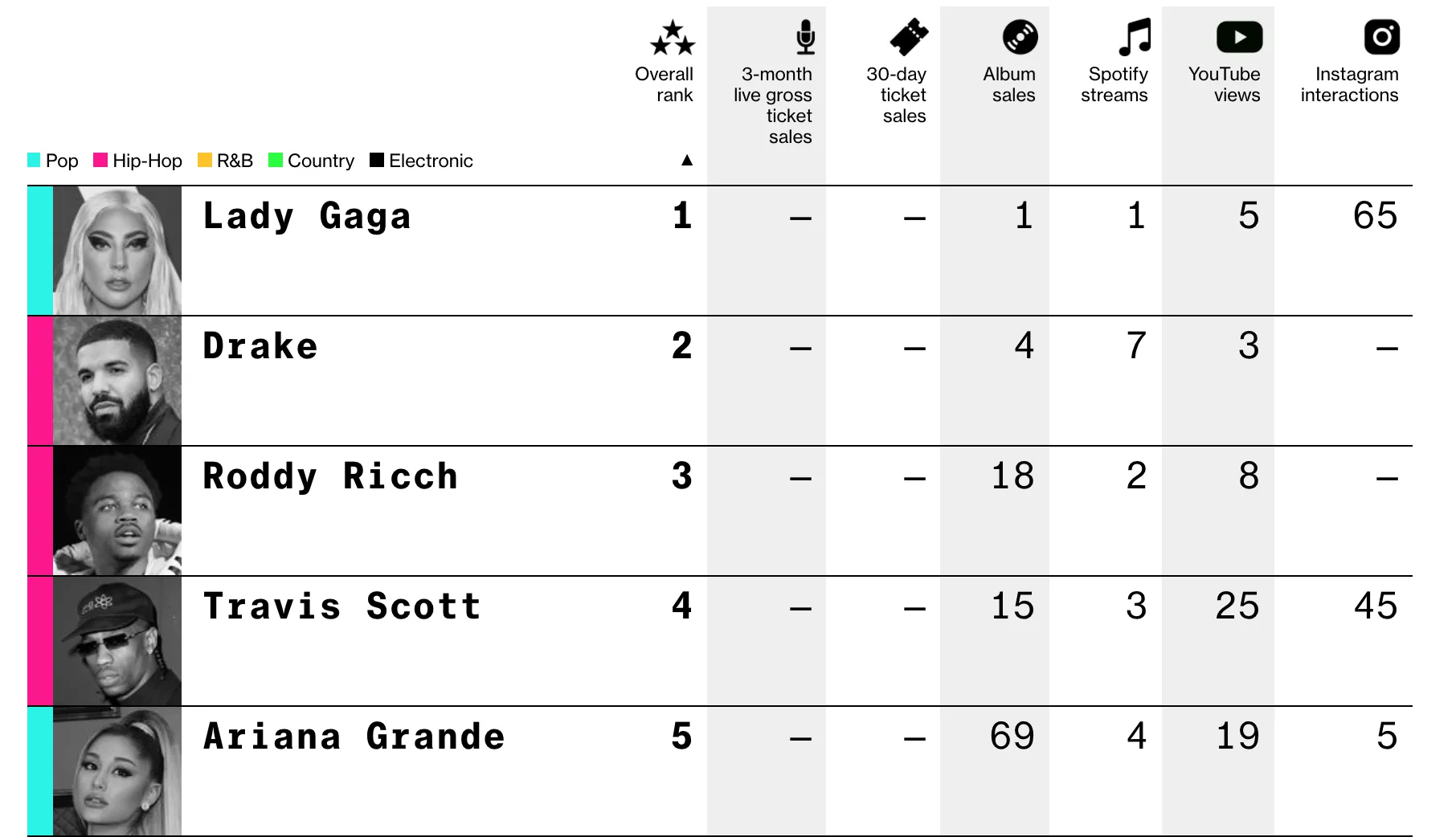 嘎嘎在美国售出了最多的专辑,并且在六月份成为全球Spotify上最受欢迎的艺人。她在YouTube上的观看次数超过了1.88亿,是第五多。
