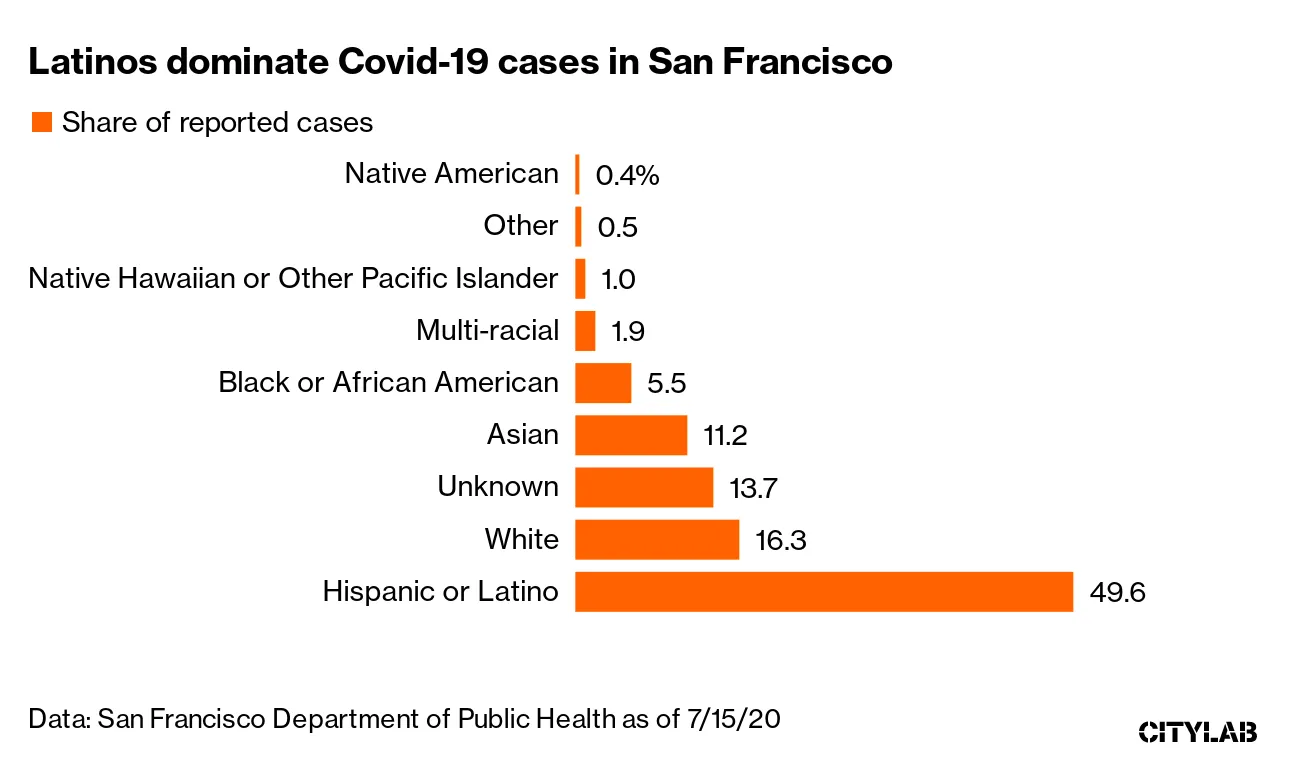 尽管拉丁裔人口在旧金山仅占15%,但他们在该市报告的Covid-19病例中占近一半。截至目前,在使命区对一个16个街区的特殊社区筛查发现,95%返回阳性结果的人是西班牙裔或拉丁裔,尽管他们仅占接受检测者的44%。所有参与筛查的白人居民均检测为阴性。
