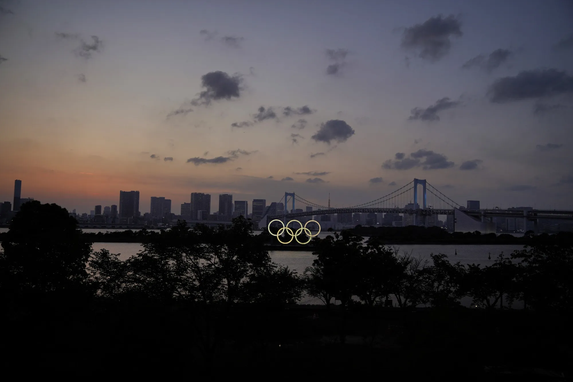 照亮的奥林匹克五环漂浮在东京的台场岛水域。摄影师:Toru Hanai/Bloomberg