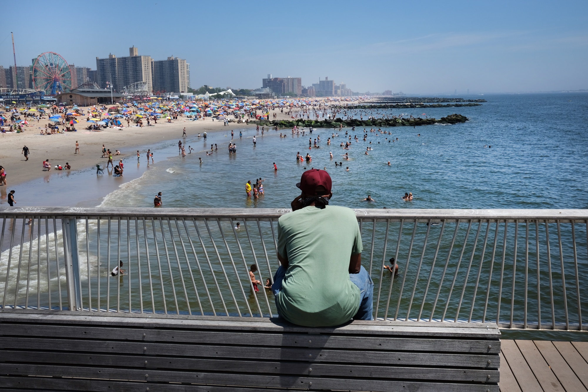 海滩游客于2020年7月19日访问布鲁克林的康尼岛。摄影师:斯宾塞·普拉特/盖蒂图片社