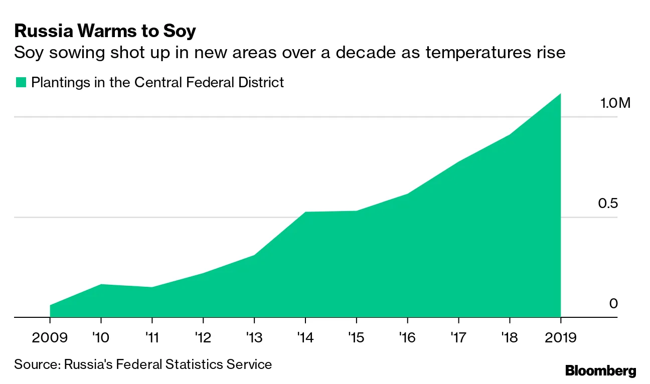 全球气温上升的多年正在融化俄罗斯的永久冻土,将土地变成肥沃的土壤,激发了一项曾经不可思议的商业: 大豆种植。2019年,在俄罗斯中部种植了110万公顷的大豆,比过去十年增加了18倍,约占该地区总耕地的7%。这是一种更大趋势的一部分,随着气温升高,作物向极地生长的范围比以往任何时候都要远。