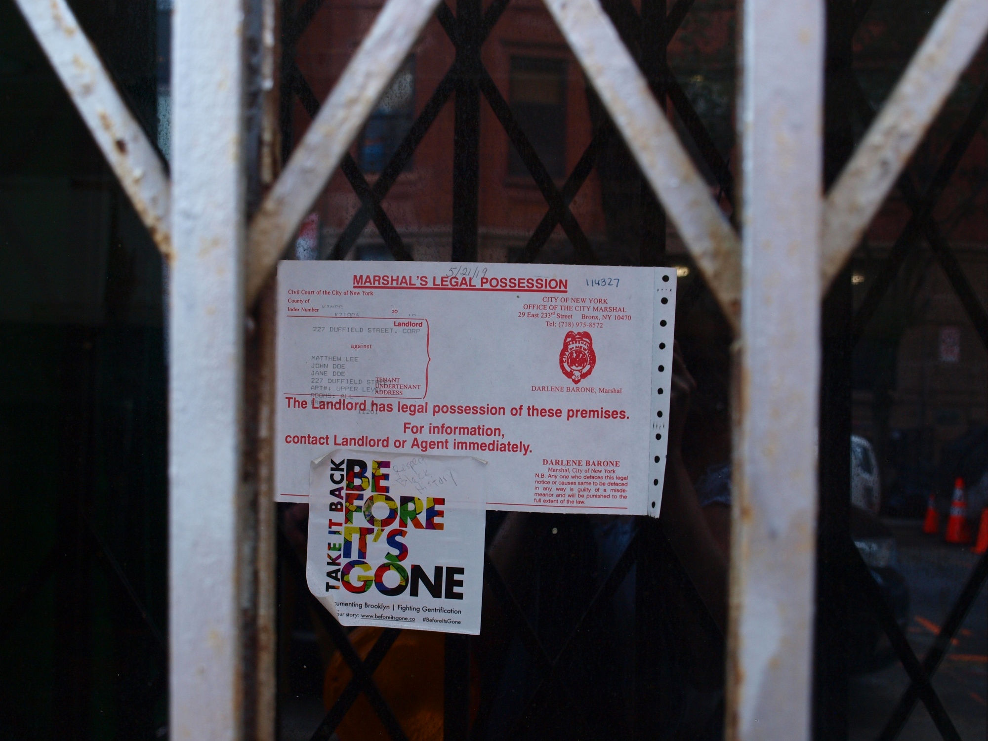 在227 Duffield街的驱逐通知,业主Samiel Hanasab于2019年决定拆除它。这座前废奴主义者的家正在考虑成为地标。