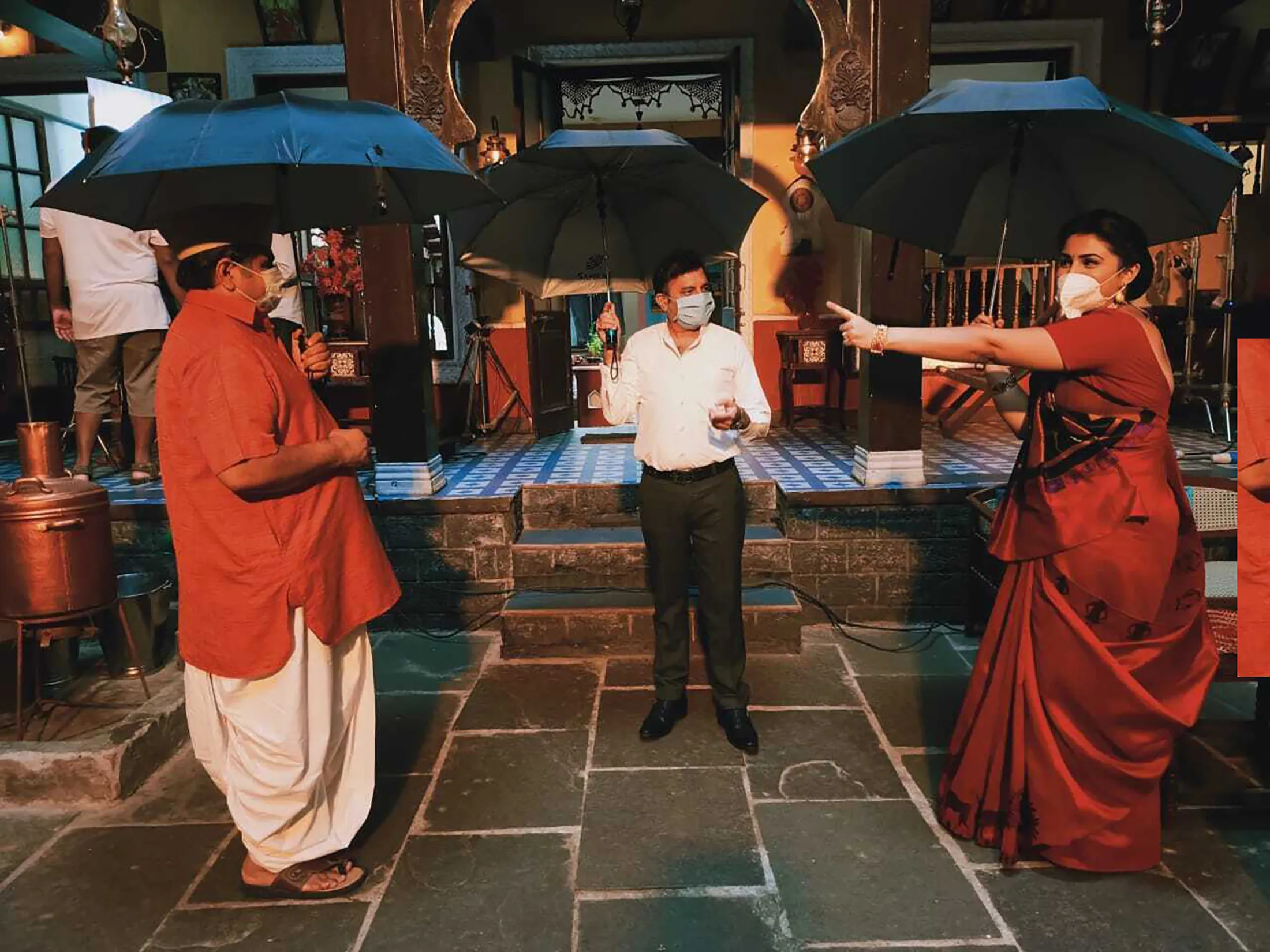 在Bhakharwadi的拍摄现场进行排练,伞是社交距离工具。版权所有:Hats Off Productions制作人 JD Majethia 想出了一个 古怪的方法 来应对他电视节目 Bhakharwadi 片场的病毒传播。 “每个人在拍摄现场都必须携带一把伞。‘拿着伞自动确保了社交距离,因此即使是无意中也不会与他人擦肩而过,’他说。口罩和伞在摄像机开始拍摄之前不会被丢弃。”