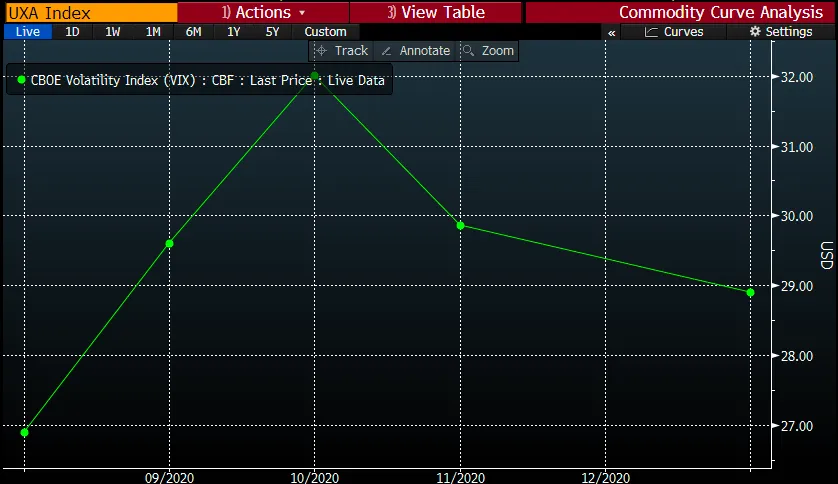查看VIX期货曲线——显示即将到来的期货合约的波动性预期——更具信息性。在这里,你可以看到在11月选举前的一个高峰,表明投资者预计那时会有更多的波动。Tallbacken Capital Advisors的分析显示,10月VIX期货合约(在11月3日选举后到期)与9月和11月合约的平均值之间存在溢价,这一溢价大致与乔·拜登对特朗普的领先幅度相符。这里的论点是,随着拜登进入白宫的机会增加,可能出现的民主党全面胜利也会导致剧烈和不确定的政策变化。然而截至周四,投资者需要考虑一个完全不同的风险:“特朗普可能在拜登明显胜利的情况下挑战选举结果或成功推迟选举的想法。”仔细观察曲线,以获取他们对这一风险的重视程度的线索。
