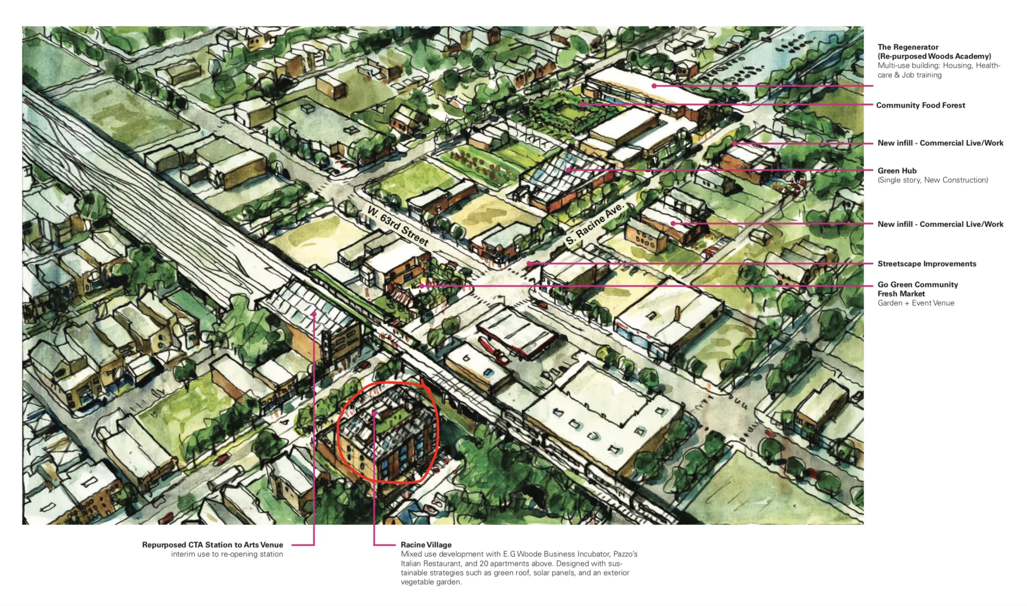 疫情迫使IMAN和Wheeler Kearns以其他方式调整他们在Racine校园的Go Green计划。早些时候,一所前小学,伍兹学院,原定用于提供大量职业培训空间;但现在已缩减,转而提供更多过渡性的宿舍式住房,供从监禁中返回的人使用。Go Green校园的其他部分也旨在让社区中长期闲置的区域恢复生机:IMAN正在倡导重新开放1994年关闭的Racine CTA El Green Line车站,以再次为社区的交通乘客服务。