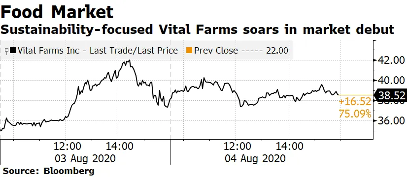 * 可持续农业公司Vital Farms在其首次公开募股后 在纳斯达克上市,定价为每股22美元,交易中几乎达到了42美元。其预期发行范围为每股15至17美元。
