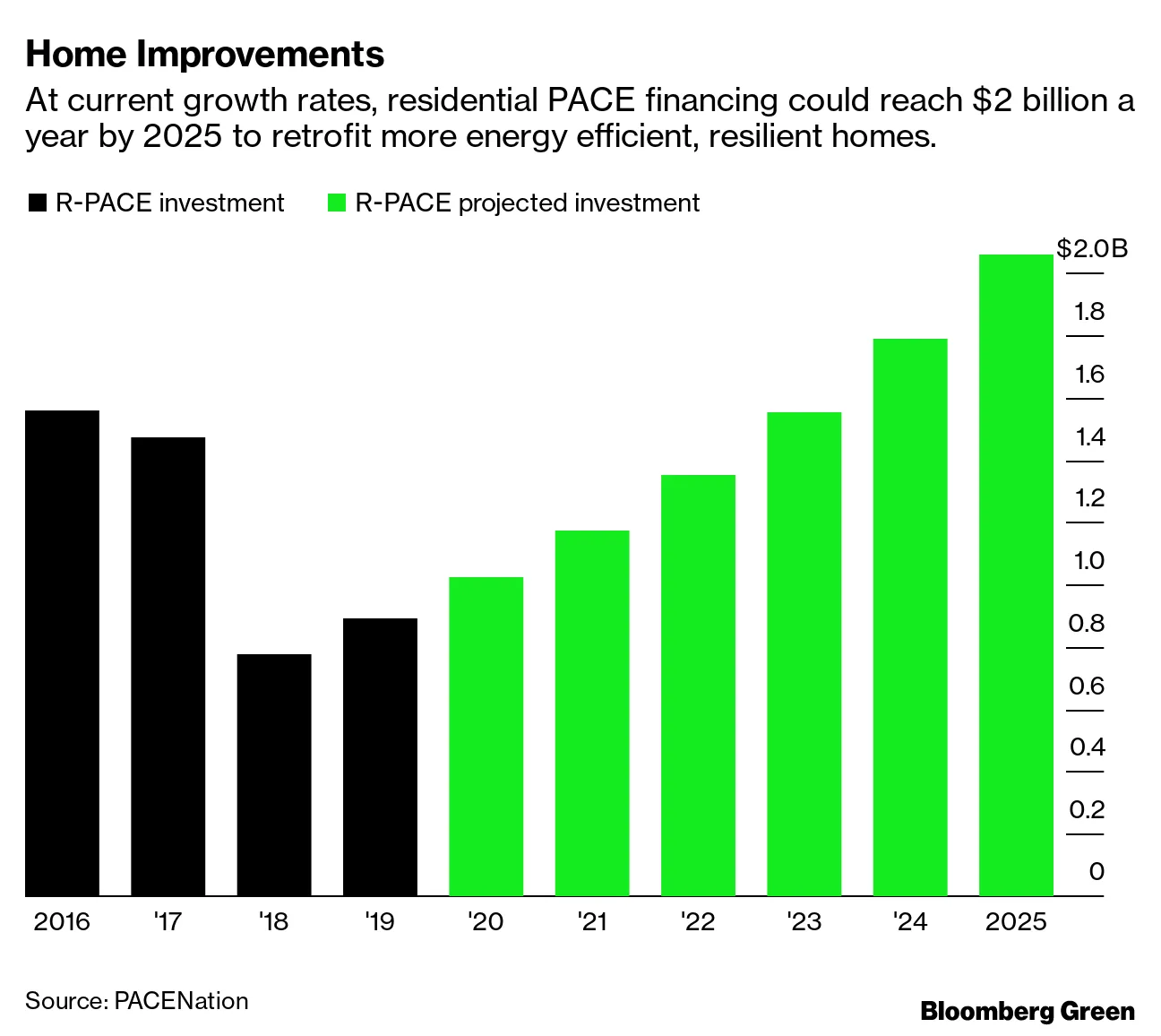 在美国,PACE融资,即物业评估清洁能源,预计到2025年将为房主和企业提供每年20亿美元的前期资金,用于太阳能电池板、电池储存以及抗飓风的窗户和屋顶。这在现有的11万亿美元美国住房抵押贷款市场中是微不足道的。但它可能会产生催化效应:对PACE升级的100万美元投资可以避免相当于1400公吨的二氧化碳排放,约等于300辆乘用车一年排放的碳量。