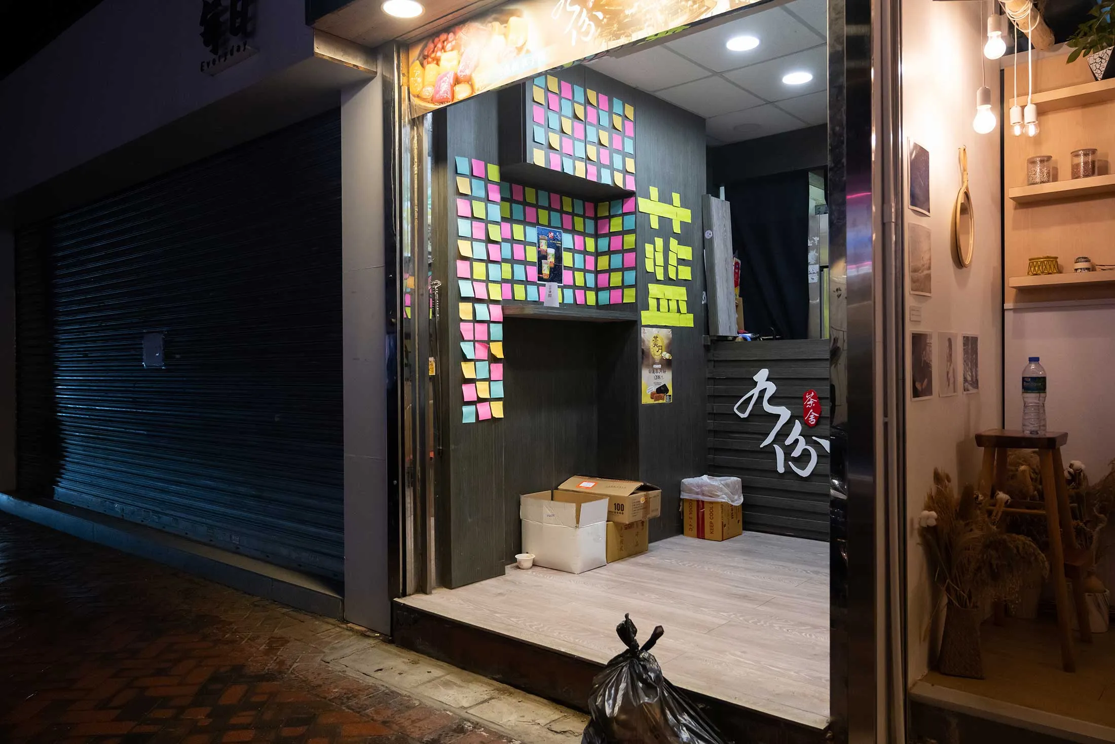 在Mainichi,一家位于旺角的日本融合餐厅,去年抗议者在与警方的冲突中避难,空白的便利贴取代了政治标语,一些之前出售的抗议筹款物品也消失了。然而,一些支持民主的图像仍然存在,包括一名戴着黄色头盔的抗议者在一片催泪瓦斯中举手向天空。还有一张海报仍然宣称“永不放弃”,餐厅老板Chong表示,这不应被视为违反国家安全法。