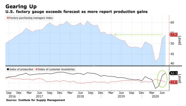 美国制造业**在七月以自2019年三月以来最快的速度扩张,因为更多工厂在订单稳固和库存紧张的情况下提高了生产。供应管理协会周一表示,其制造业指数上个月从52.6上升至54.2。