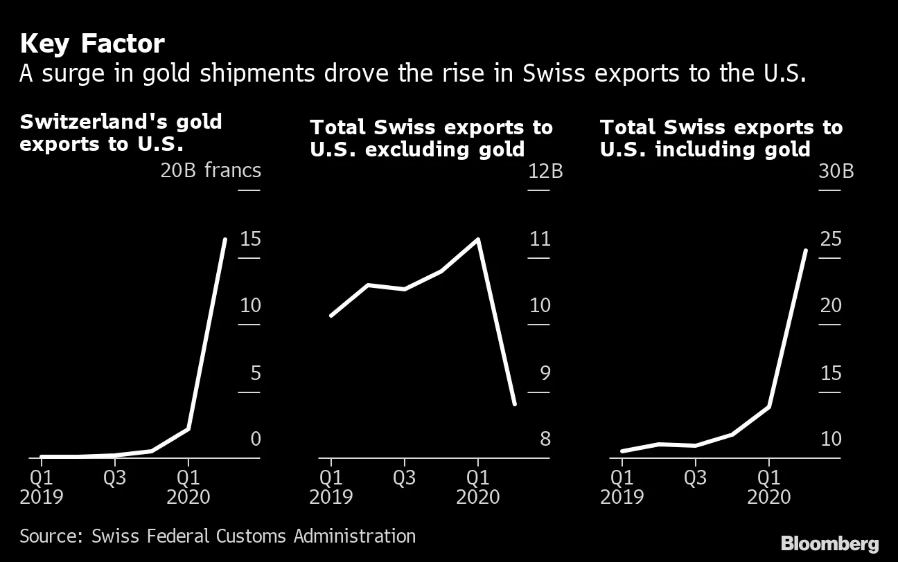 供应链最新动态:瑞士对美国的黄金出口激增 - 彭博社