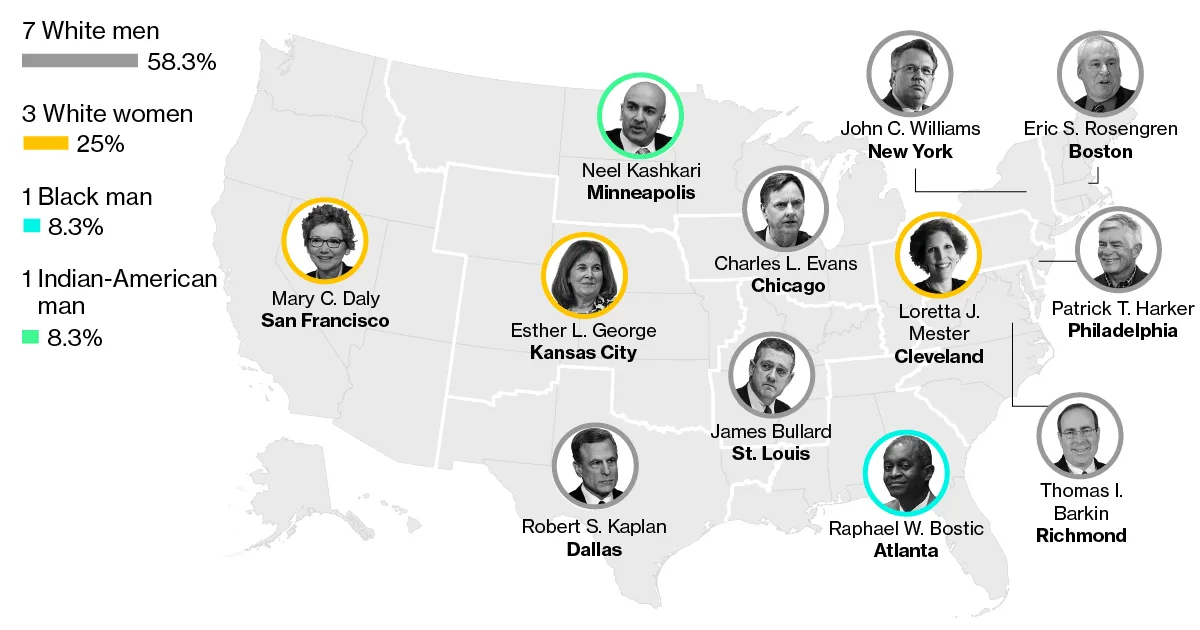 美联储的高层主要由白人男性主导。来源:美联储,彭博社研究### 按数字来看