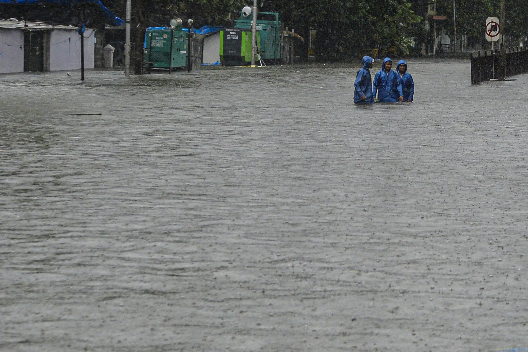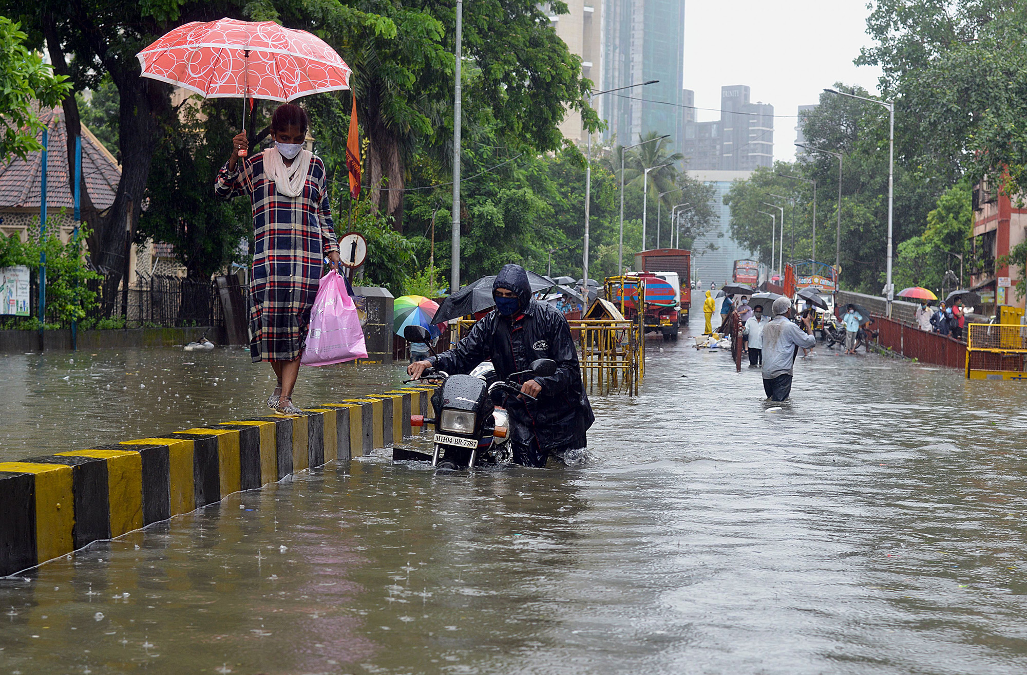 通勤者在8月4日孟买的暴雨中涉水而过。