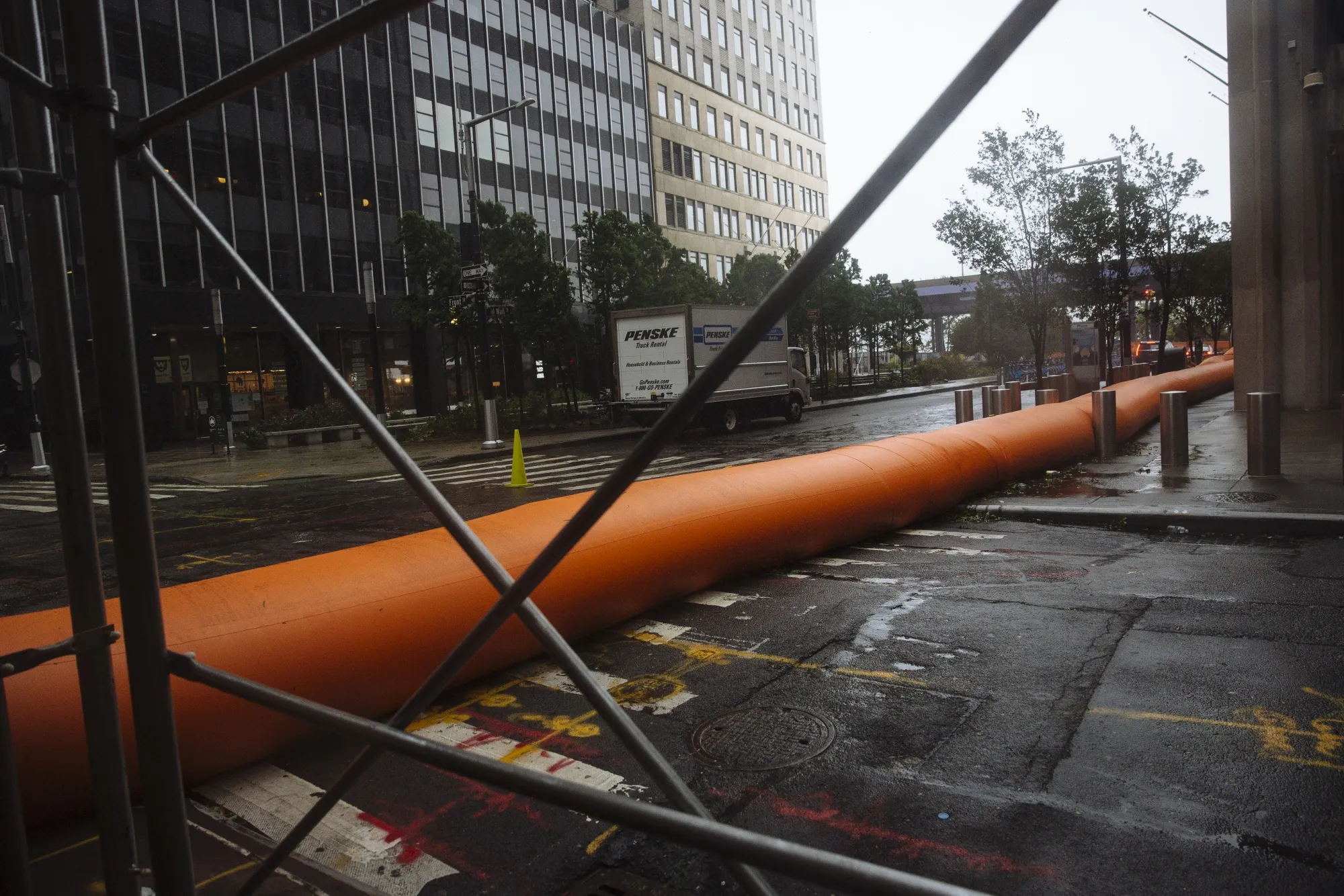 在纽约,热带风暴伊萨亚斯期间,一道洪水屏障横跨街道。