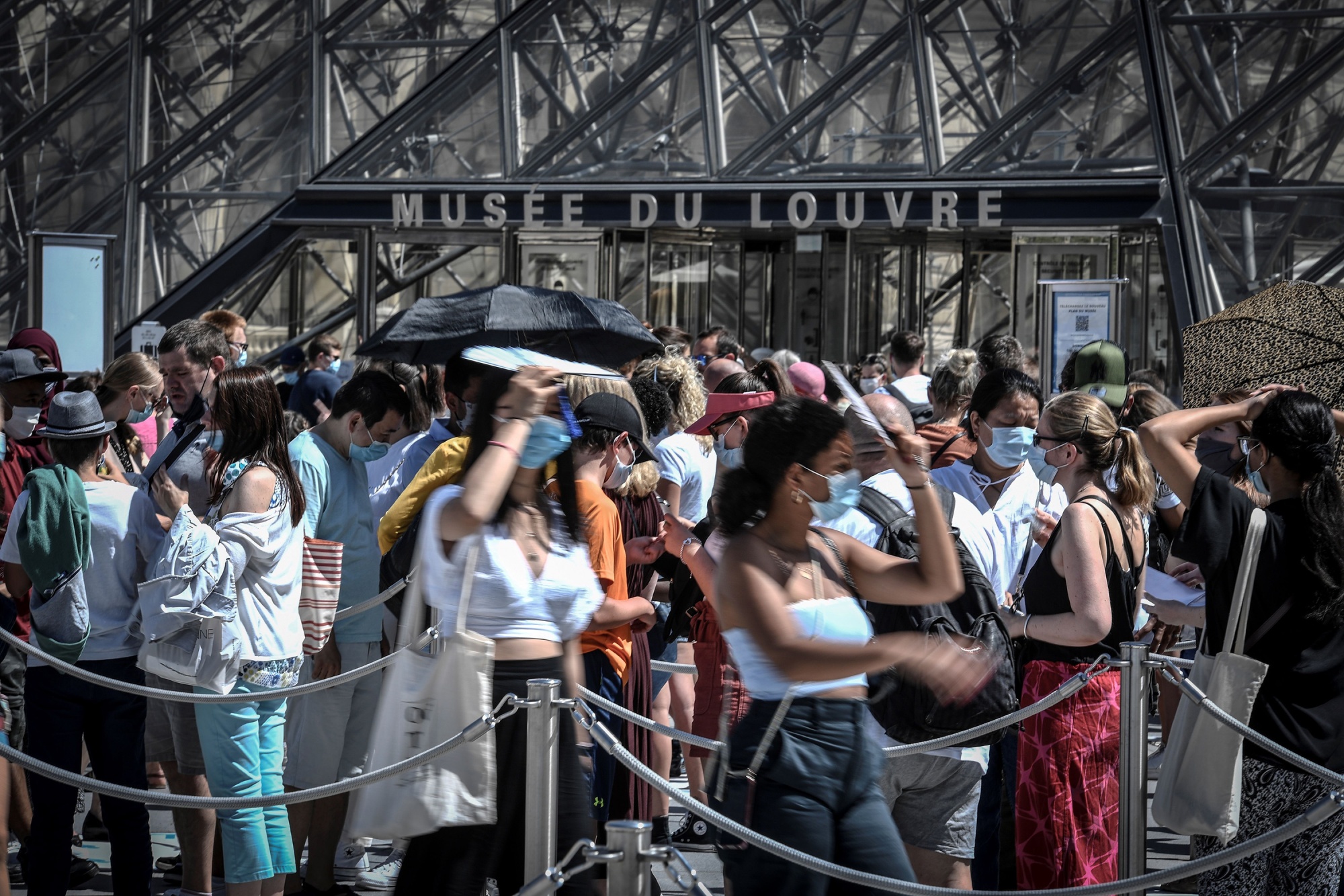 人们在巴黎卢浮宫入口排队,佩戴着防护口罩,时间是8月6日。