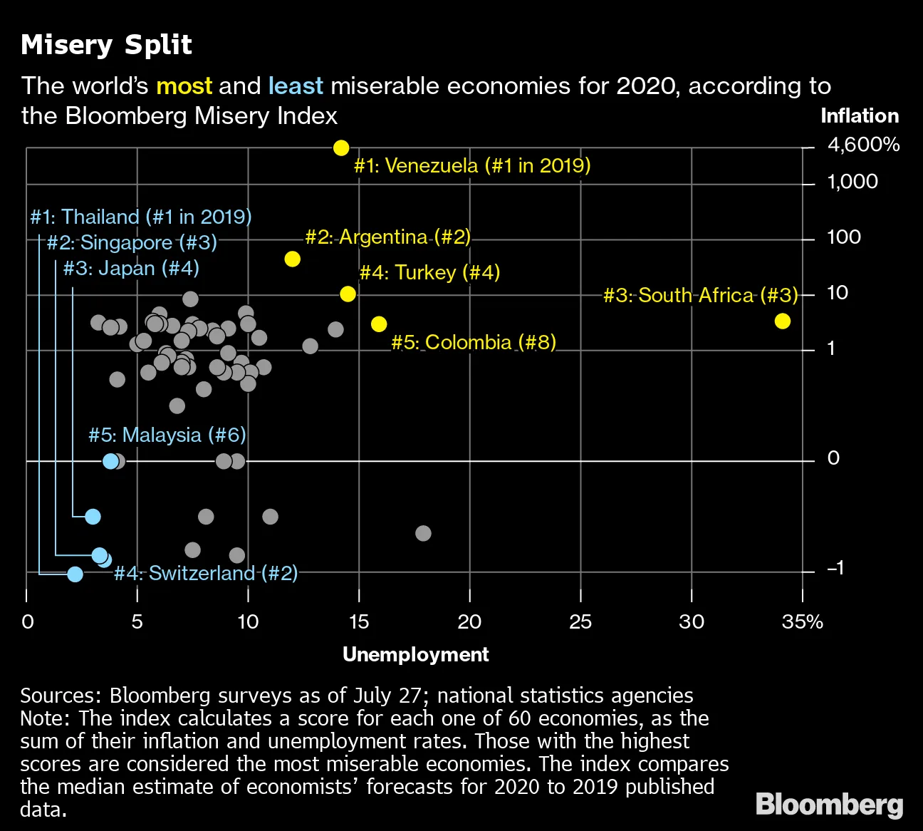 美国在 彭博社的痛苦指数中下降了25个名次,从第50位降至第25位,该指数统计了60个经济体的通货膨胀和失业前景。只有冰岛、以色列和巴拿马在年度排名中接近这种程度的恶化。