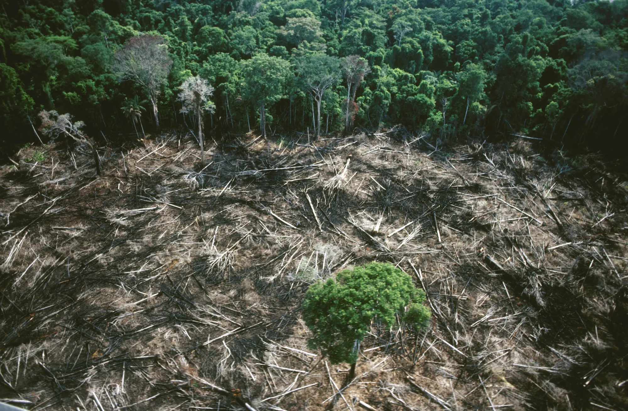 一棵孤独的烧焦树木矗立在巴西亚马逊盆地罗东尼亚州波尔图韦柳周围的砍伐森林区域。