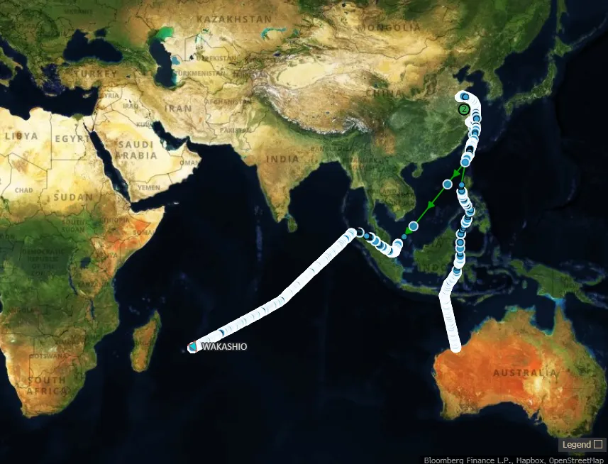 Wakashio于6月初离开澳大利亚的主要铁矿石运输港口赫德兰,并在两个中国港口卸货,根据彭博社编制的船舶追踪数据。该船于7月4日离开中国,7月14日左右在新加坡加油,正前往巴西时在毛里求斯海岸约1英里处搁浅。