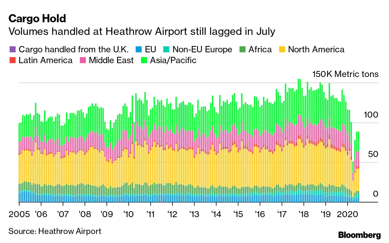 随着新冠疫情继续对供应链造成破坏,伦敦希思罗机场的货运量在七月份保持低迷,数据中心显示。货运量下降32%也与希思罗通常的航线网络有三分之五被停飞有关:大量货物通常在商业飞机的货舱中运输,而增加货运飞机对大多数航线来说并不是一个选项,因为没有足够的需求来填满一架飞机。