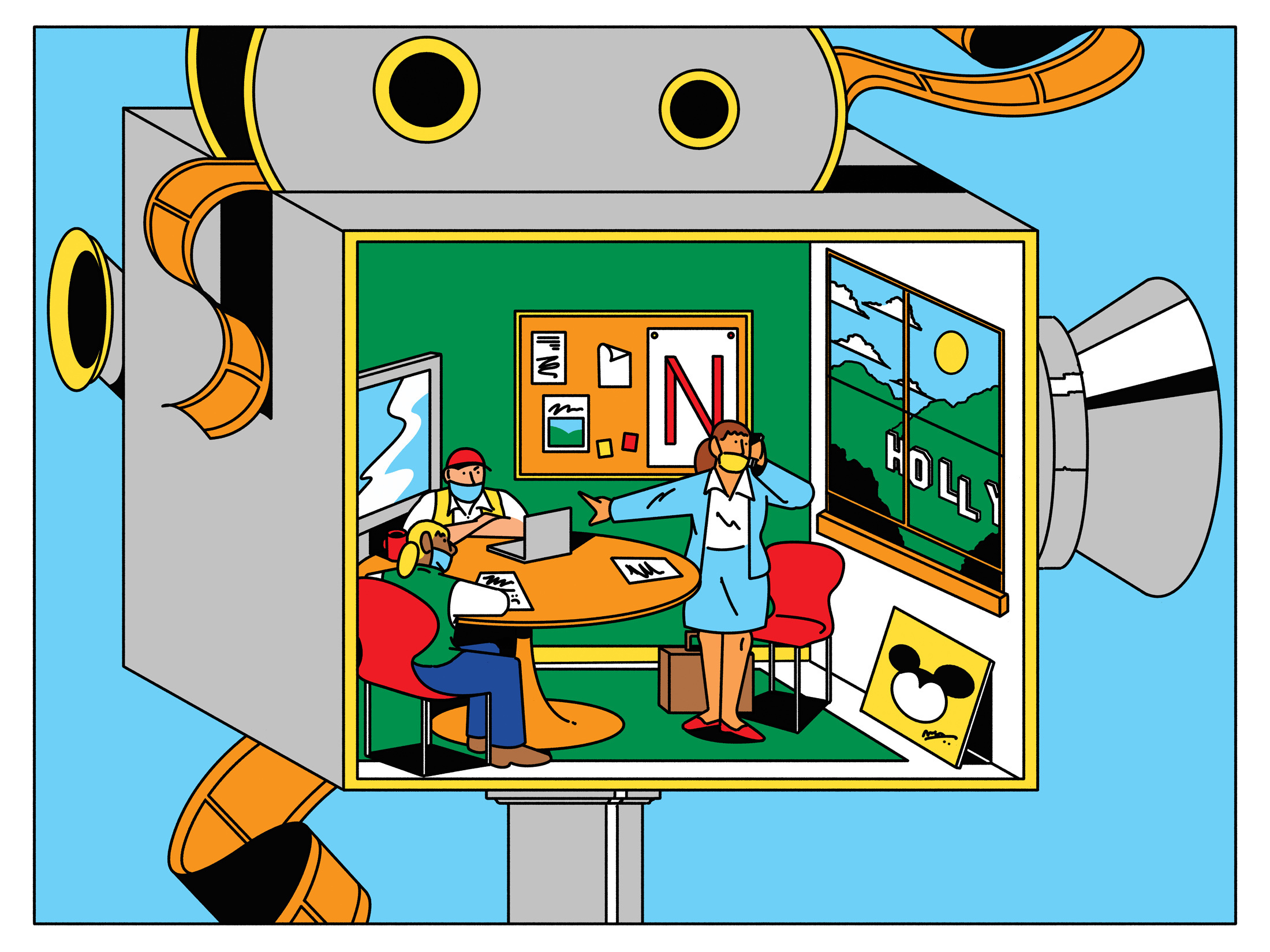 插图:杰克·泰勒为《彭博商业周刊》创作在 Covid-19 大流行期间被困在家中,美国人毫无节制地观看电影和电视。他们已经看完了 老虎王 和备受赞誉的 汉密尔顿。数百万人甚至抽出时间观看低俗的游戏节目,如 地板是熔岩(听起来就是这样),这成为了 Netflix Inc 的一大热门。在三月末和四月初的高峰期,美国人每周观看超过 1600 亿分钟的流媒体视频——相当于每人约 8 小时,是一年前的两倍,那时去电影院并没有太大风险感染致命病毒。