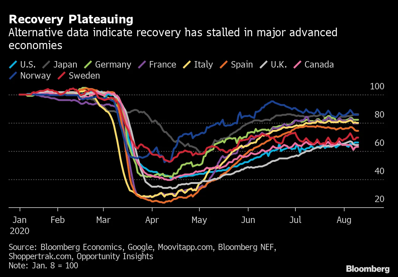 复苏停滞不前,主要发达经济体中,一些国家的活动水平已达到低于危机前的上限,彭博经济学的指标整合了信用卡使用、旅行和位置信息等高频数据。德国、法国和意大利等欧元区经济体,以及挪威和日本,最接近疫情前的水平,而西班牙稍微落后。 英国、美国和加拿大的活动水平仍然远低于年初的水平。