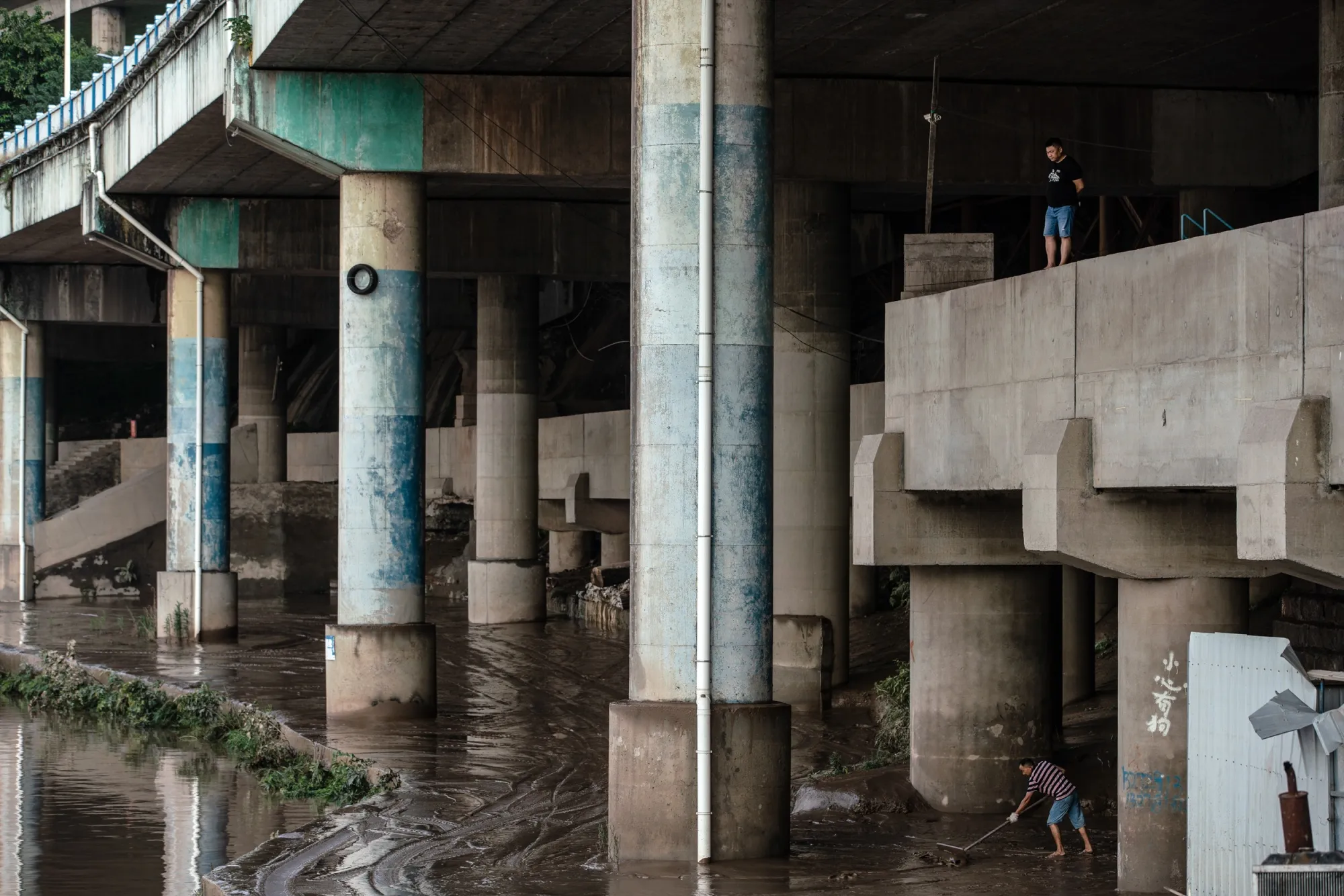 在重庆老街这个破旧的社区,靠近长江,店主刘正在清理上个月洪水造成的混乱。她在外面的路面上排放了几十双湿透、沾满泥土的鞋子,希望能吸引路过的行人,“我会以任何价格出售。”