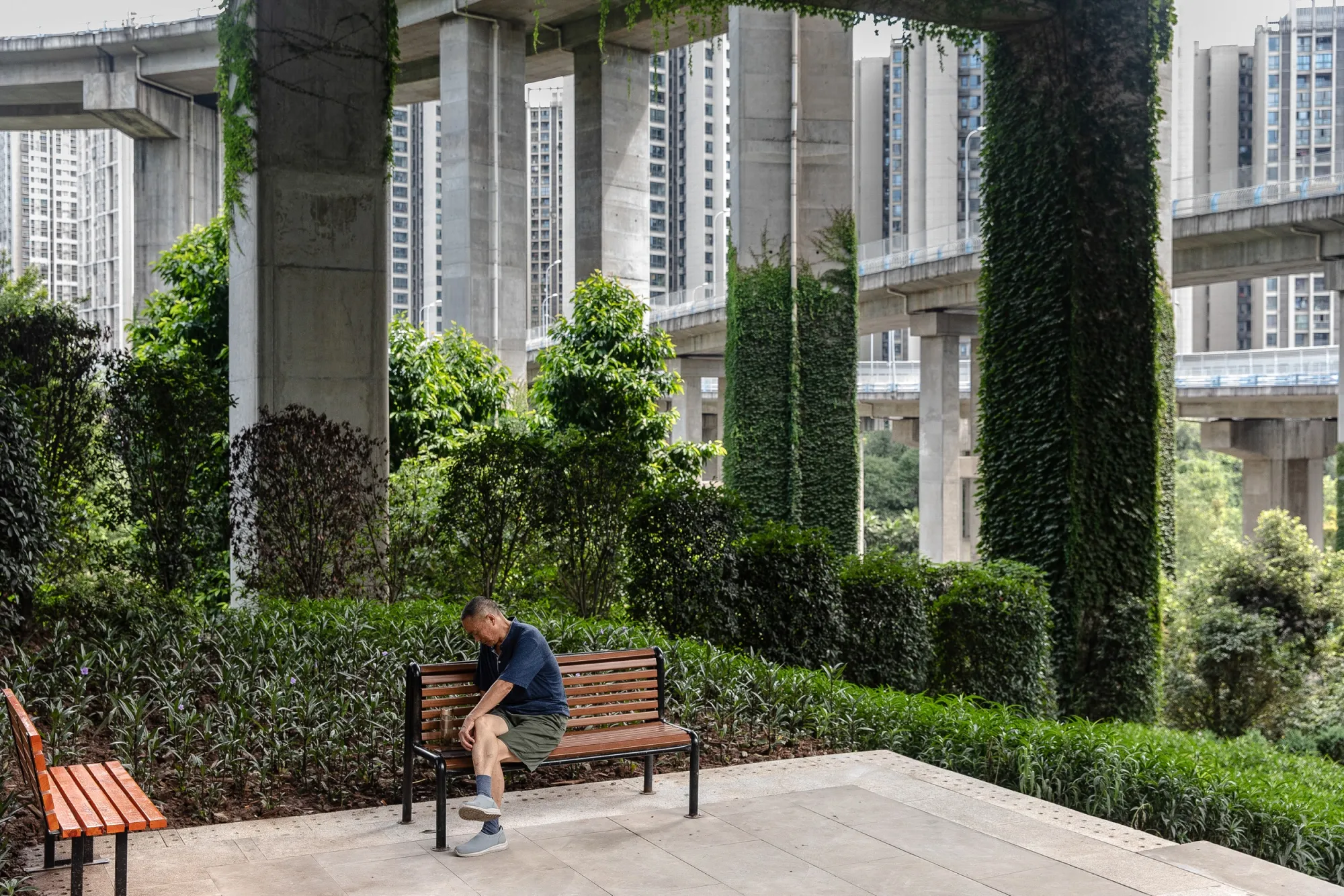 一个男人在位于重庆的高架公路交汇处的鹅公岩公园休息。摄影师:沈启来/彭博社然而,中国的海绵城市倡议表明,中国的潮流正在转变,发展不再是国家公民所能接受的唯一选择。