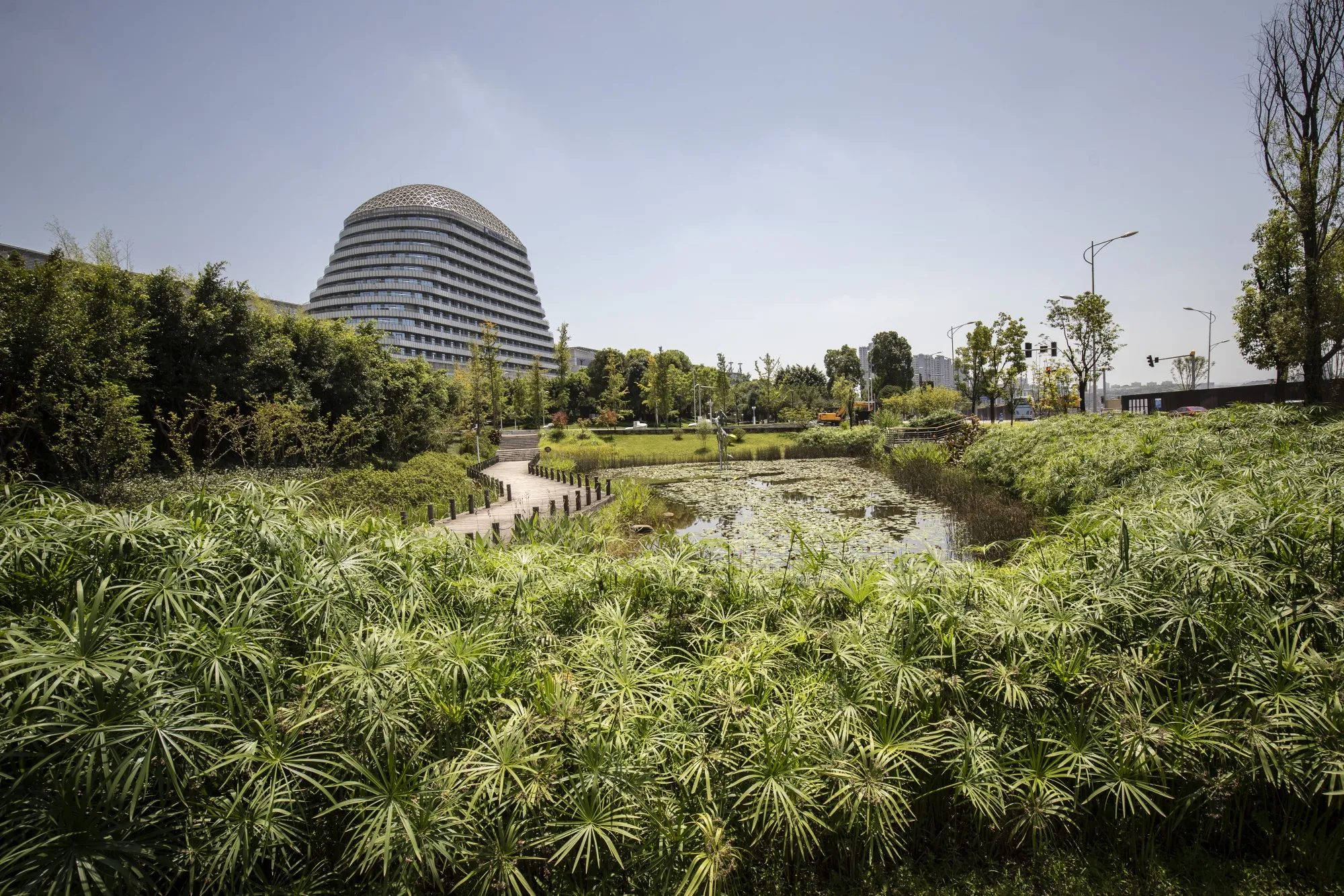 在重庆东北边缘,围绕着巨大的新国际展览中心,新兴的悦来地区被设计为“海绵城市”。中国的城市洪水部分是因为大多数曾经能够吸收降雨的蓄水土地——草地、森林和湖泊——已经被铺成了水泥,迫使雨水直接流入那些建造不良或过时的污水和排水系统,这些系统已经无法应对。
